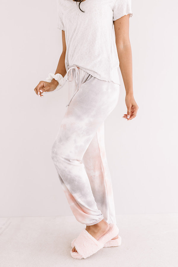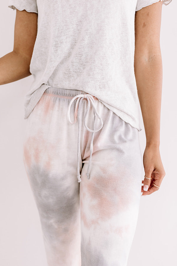 You won't want to wear any other piece when "sleeping in" than these cozy joggers featuring soft lightweight material patterned with charcoal and light pink hued tie dye, an elastic waistline with a tie belt, and a relaxed pants silhouette that falls into fitted ankle-length hemlines! This comfy piece styles perfectly with a basic matching tee, a scrunchie, and some fuzzy slippers for the ultimate two-piece lounge look!