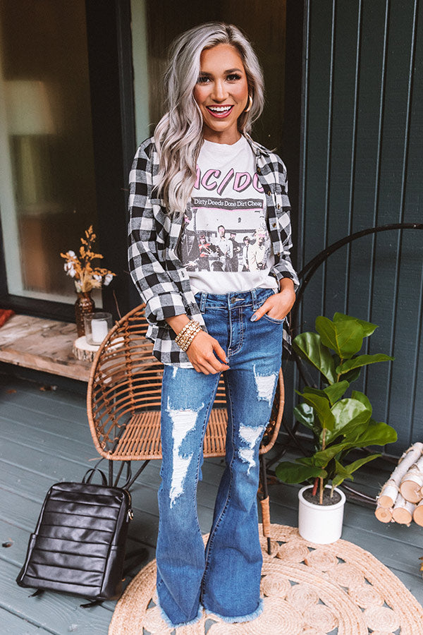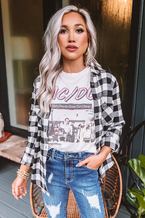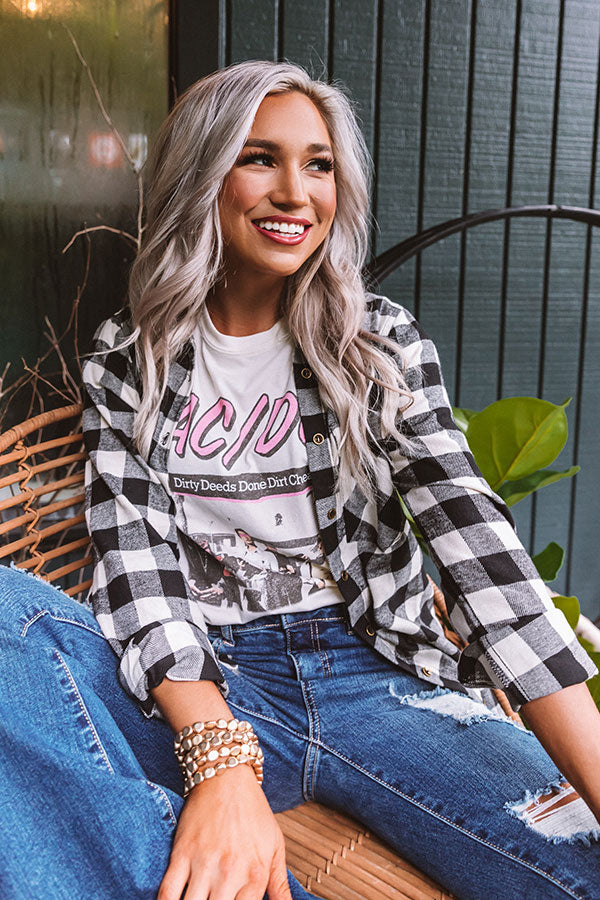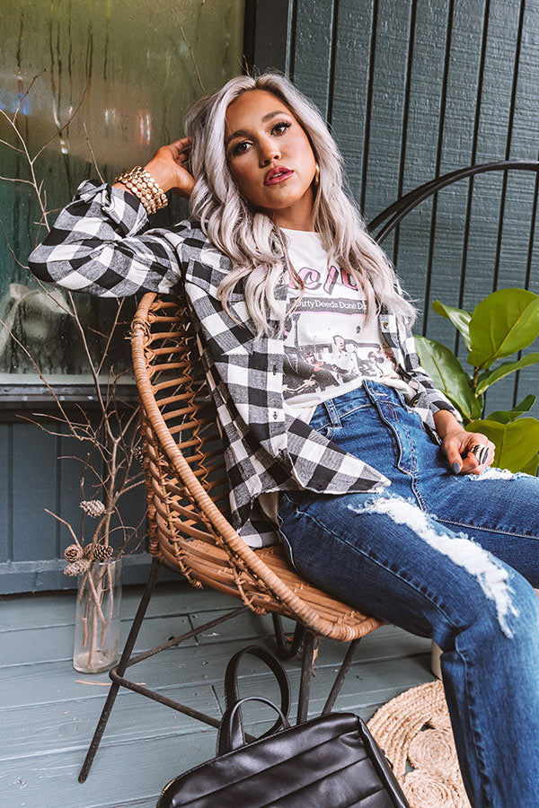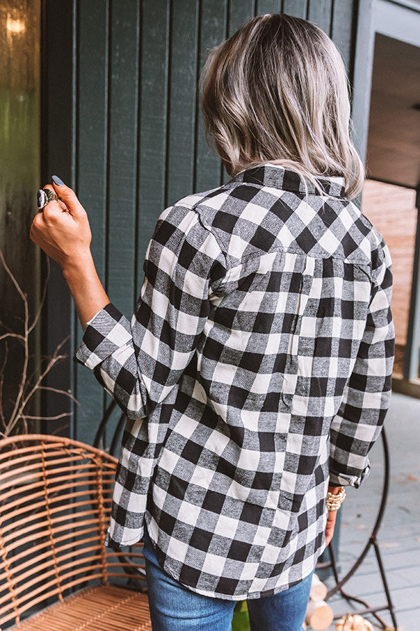 You won't find a more versatile fall piece that our adorable "Slice Of Pie" top featuring soft lightweight material patterned with a white and black checkered flannel print, a high collared neckline, long loose sleeves with button closure cuffs that can be rolled, a button down front, accent chest pockets with flap closure, and a relaxed silhouette that falls into a rounded hemline, perfect for layering or wearing solo! Measurements