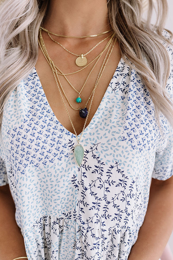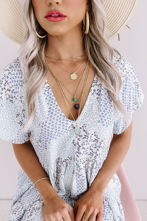 Take a "slice of summer" with you wherever you go by accessorizing with this adorable necklace featuring six layered gold chains adorned with various blue hued faux stone charms!