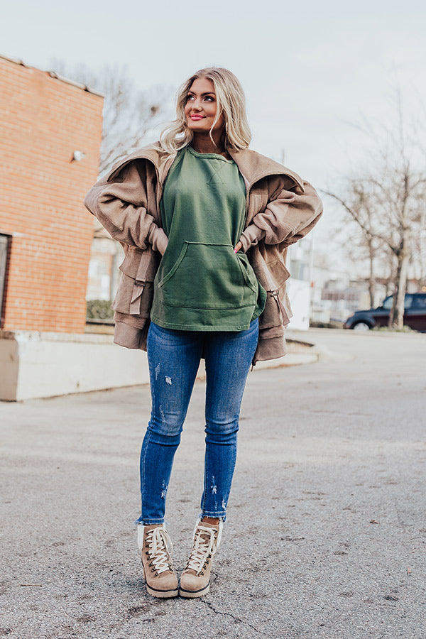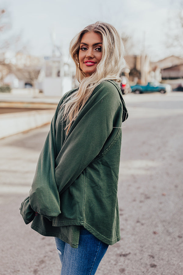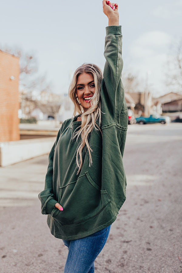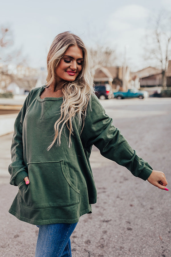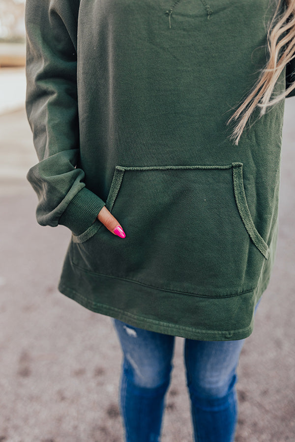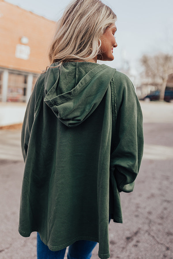 Slip into cozy with this adorable dark green hoodie featuring warm material, a rounded neckline with a hooded back, long loose sleeves, a large accent kangaroo front pocket, and a slouched silhouette that ends in a straight hemline!