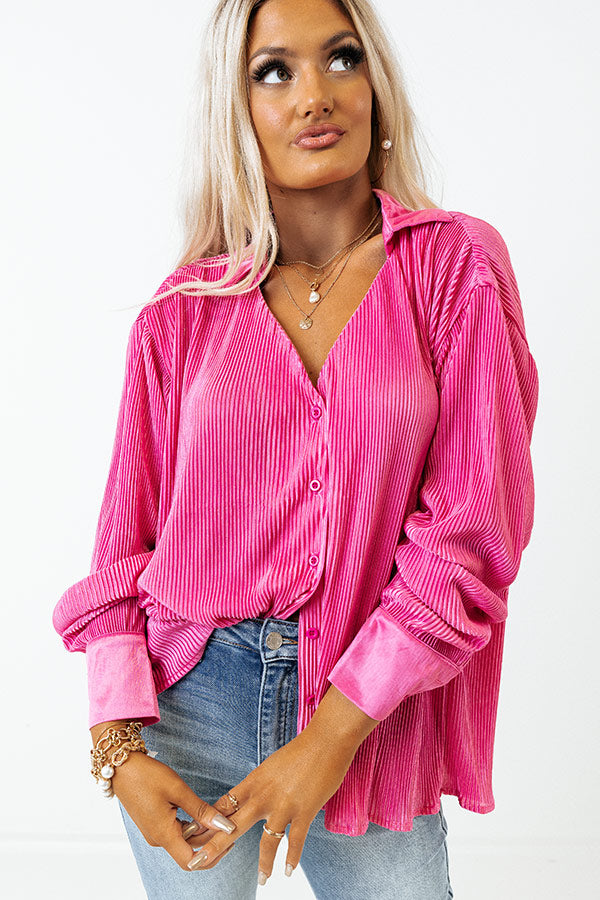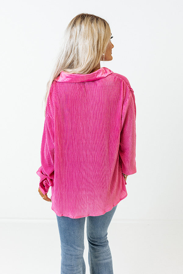 You'll be winter resort ready in our fabulous 'Slope City' pleated top! Features, pink hued pleated satin material, collared v-neckline that goes into a button down front, long loose cuffed sleeves with button closure, and a relaxed silhouette that falls into a straight hemline.