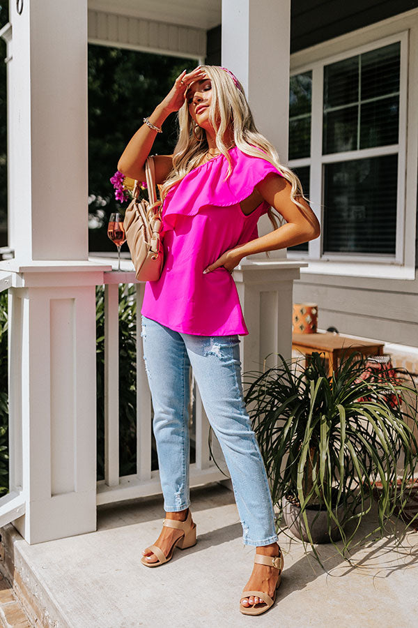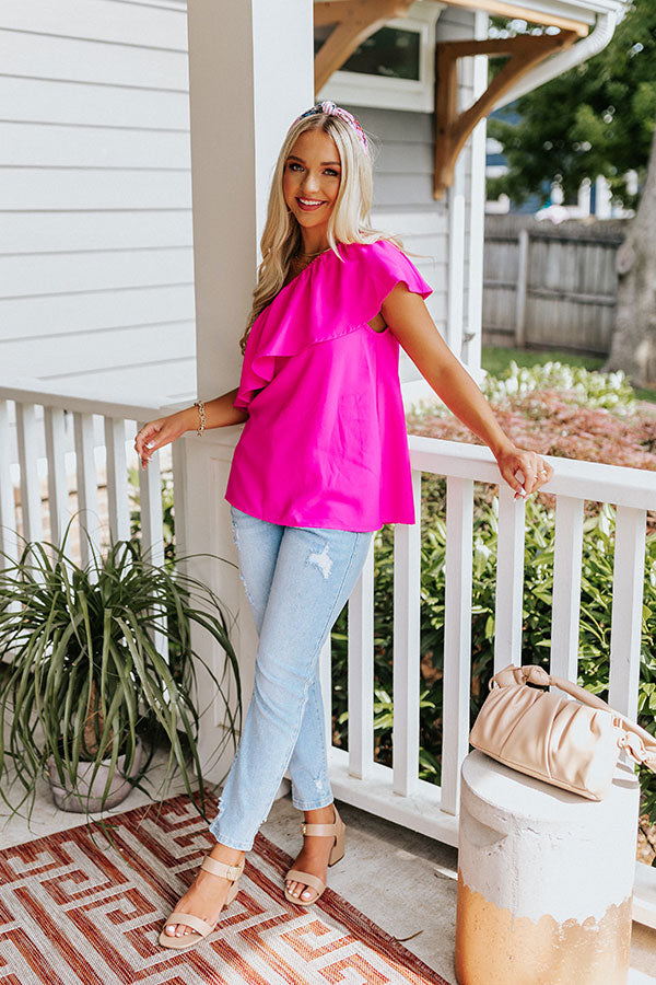 Dance to the beat of your own tune in this romantic hot pink top featuring lightweight material, a diagonal neckline and upper back, a ruffled overlay bodice with a cap sleeve, and a flattering silhouette that ends in a straight hemline! Measurements