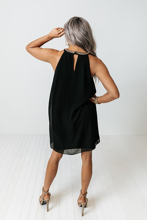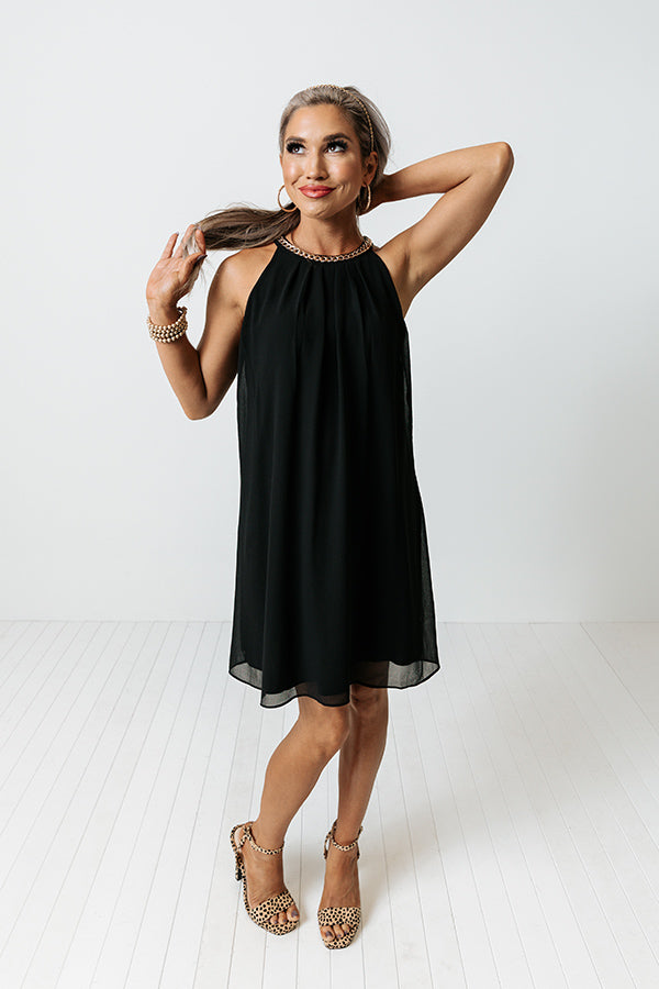 Twirl into style in our beautiful little black 'Slow Dance Under The Stars Dress' featuring lightweight and breezy material, a high neckline with a gold chain detail, sleeveless shoulders, a keyhole accented upper back with a button closure, and a relaxed silhouette that falls into a straight mid-thigh length hemline! Measurements