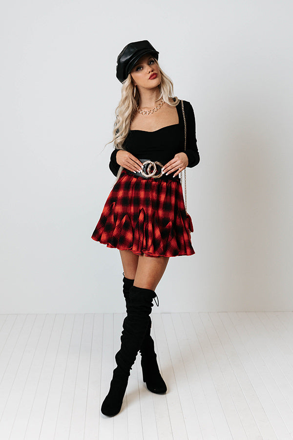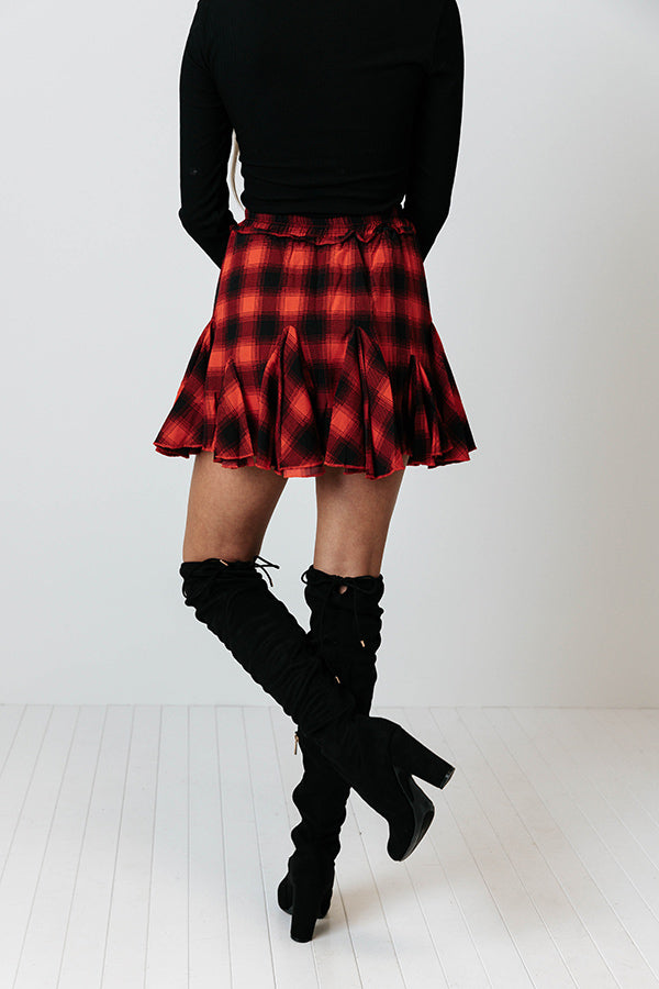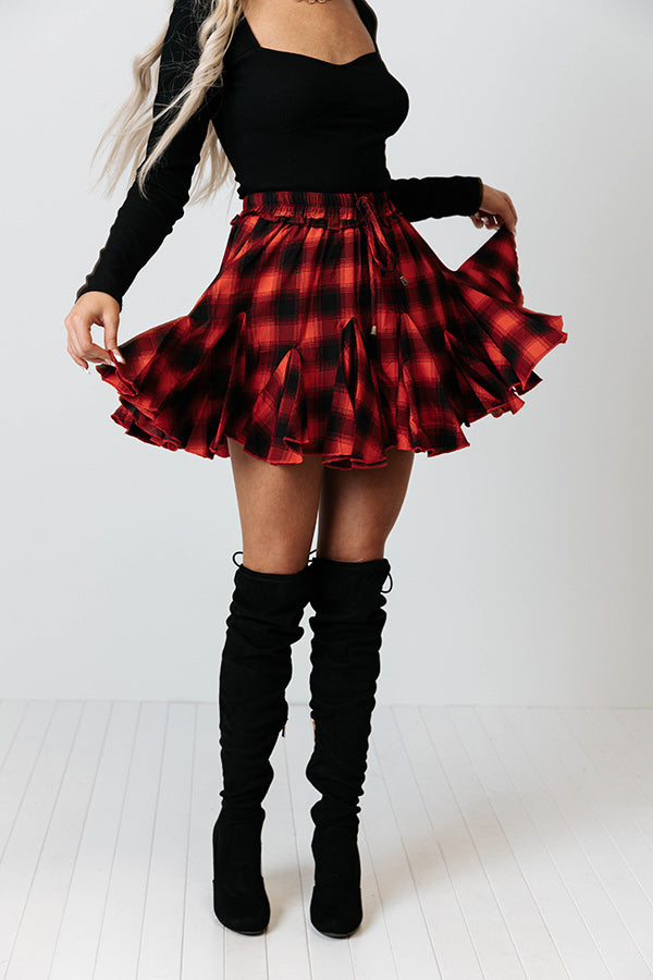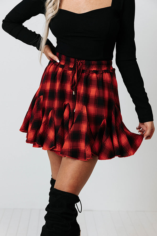 Get ready for a small town holiday celebration in this darling skort featuring lightweight and flowy material patterned with a red and black checkered plaid print, an elastic waistline with a tie closure, and a relaxed silhouette that falls into a pleated upper-thigh length hemline!