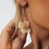 - Dangling gold drop earrings with ivory colored floral design and rhinestone accents