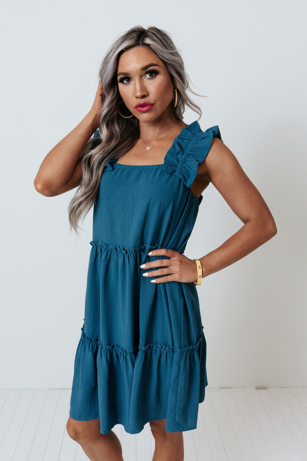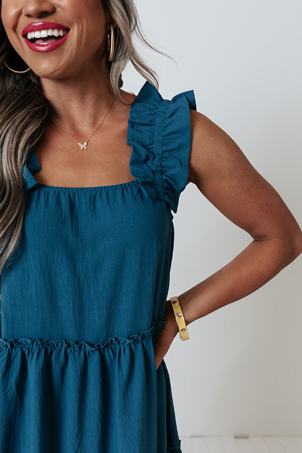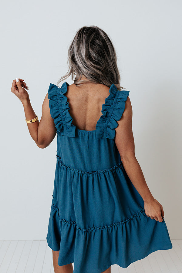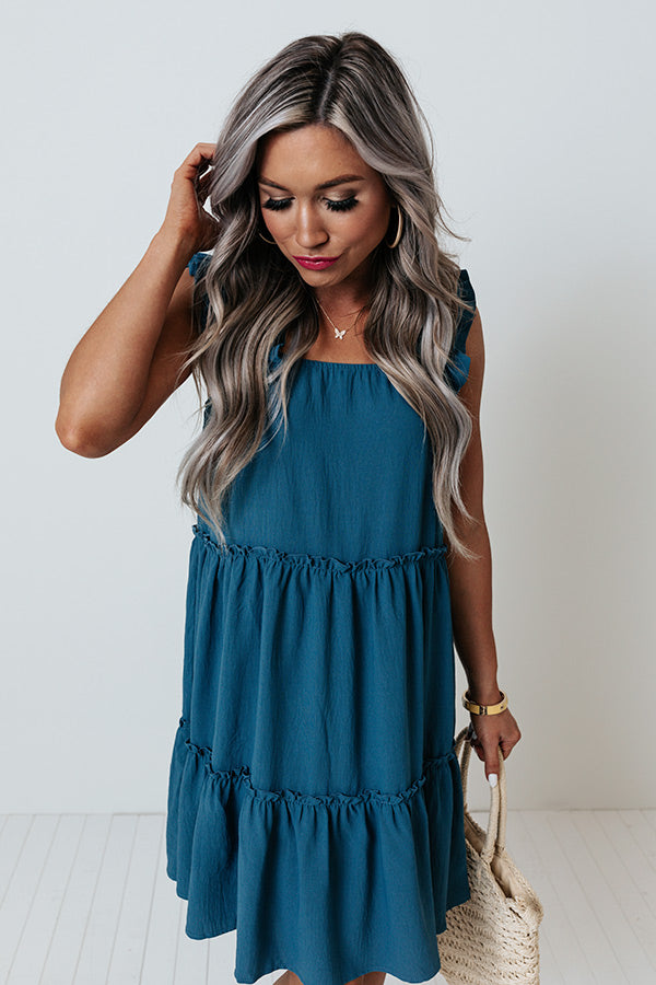 We have no doubt you will be wearing a smile when see how great you look in this darling shift dress! It features lightweight and flowy navy material, a square neckline, wide ruffled shoulder straps, tiered accent seams, and a relaxed silhouette that falls into a straight mid-thigh length hemline! Measurements