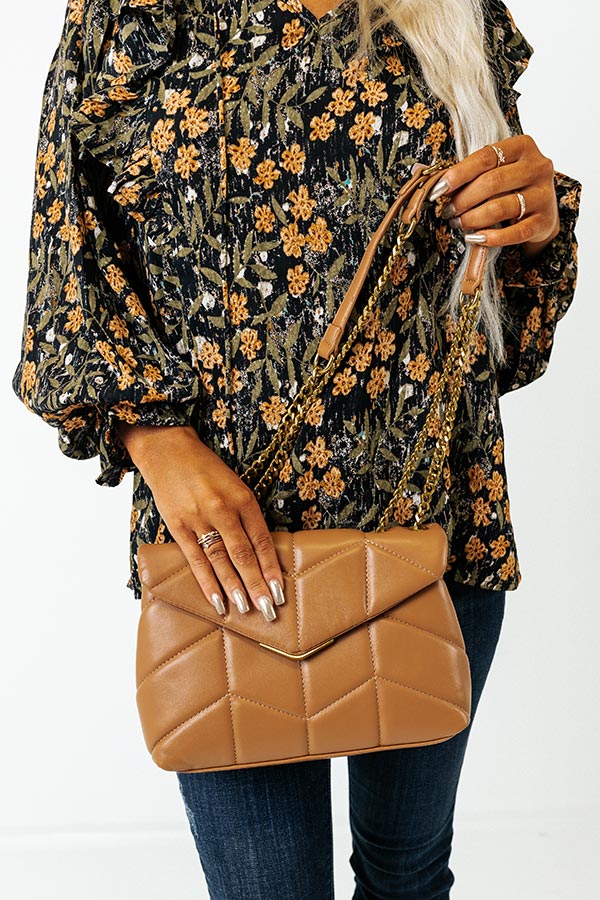 Our 'Smooth Terrain' faux leather crossbody is your new go-to bag for the season! This versatile purse features lightweight iced mocha colored faux leather material with quilted texturing, yellow gold hardware, flap closure with snap button, two chain link shoulder straps, and two fully lined interior pouches, one with small double pocket feature and one with zip closure pocket.