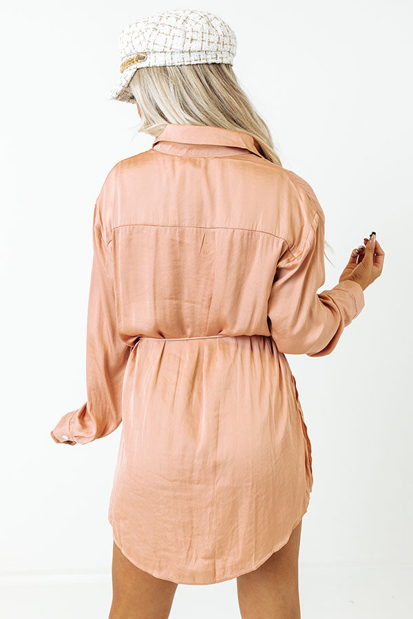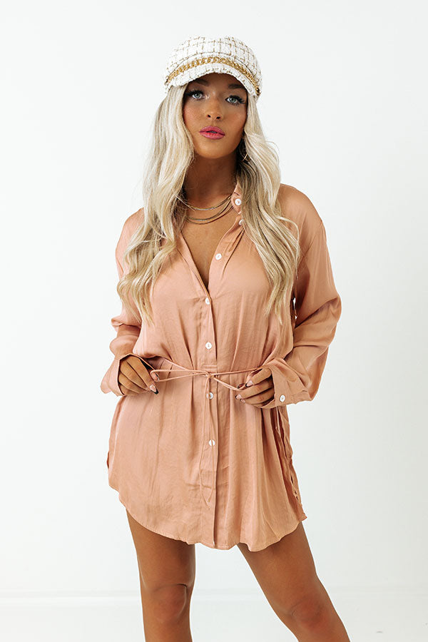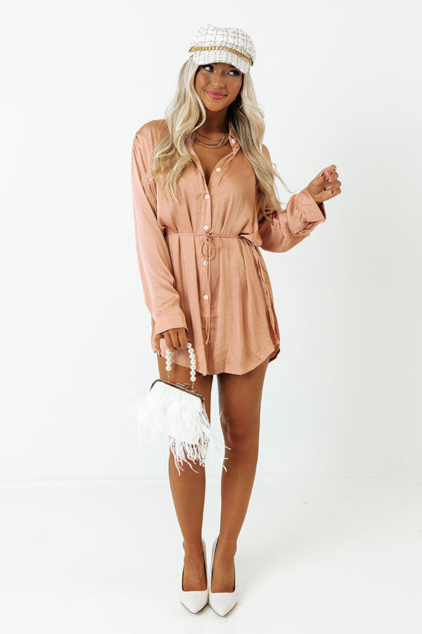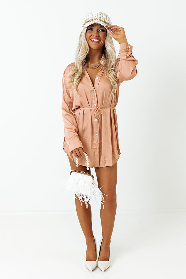 Dressed up or down our 'Smooth Terrain' romper is the versatile piece you need in your wardrobe this season! This darling romper features a lightweight peach colored material, collared neckline that goes into a button down front, front tie to cinch the waistline, long cuff sleeves with button closure, side slits beginning at the waist to show off a peek of the built-in shorts, and a figure flattering silhouette that falls to rounded upper-thigh length hemlines.