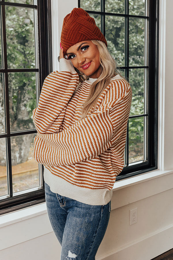 Everybody will know you're ready for fall when you wear our adorable 'Smoothie Bar' top featuring soft knit material patterned with horizontal rust and white accent stripes, a rounded neckline, long loose sleeve with fitted cuffs, and a slouched silhouette that falls into a straight hemline! Measurements