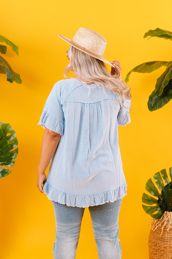 Plus Size - Start transitioning to fall in style with our adorable airy blue 'S'more Kisses Shift Top' featuring lightweight material, a high rounded neckline, short loose sleeves with flared ruffle cuffs, exposed accents seams, raw-cut trim detailing, and a relaxed silhouette that falls into a ruffled hemline! Measurements