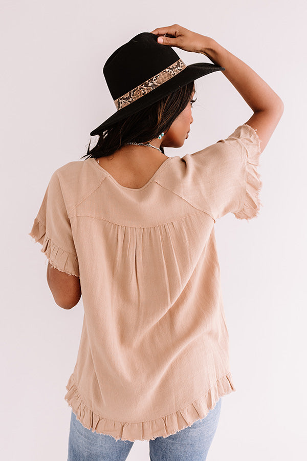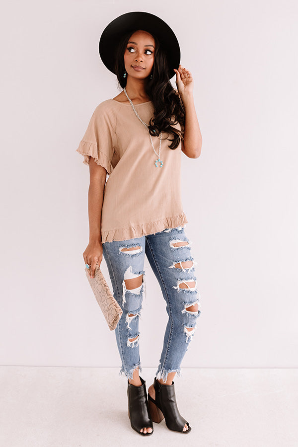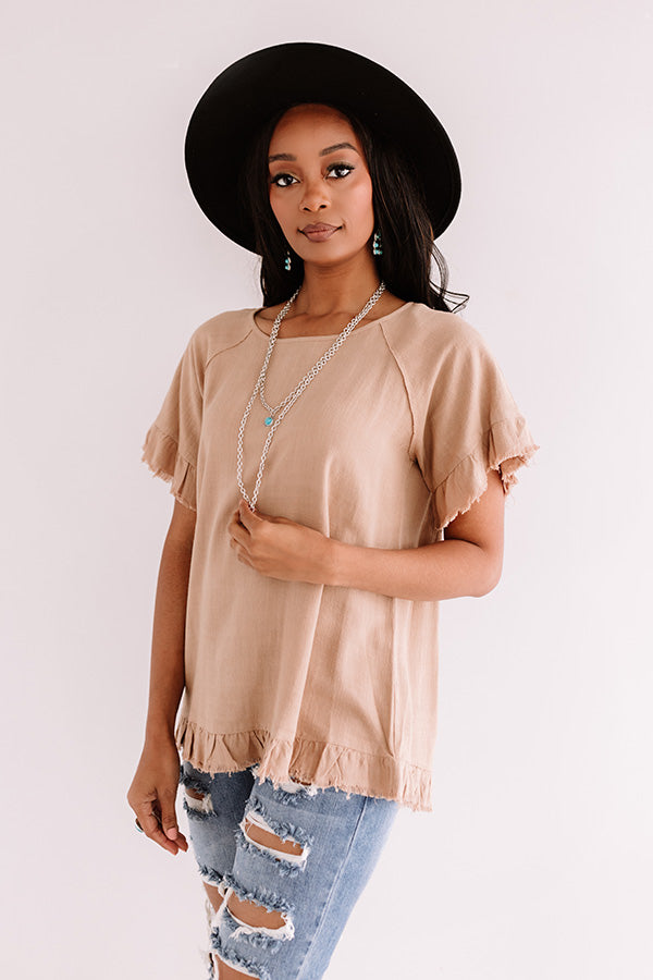 Start transitioning to fall in style with our adorable khaki colored "S'more Kisses Shift Top" featuring lightweight material, a high rounded neckline, short loose sleeves with flared ruffle cuffs, exposed accents seams, raw-cut trim detailing, and a relaxed silhouette that falls into a ruffled hemline! We have paired this cutie with some distressed ankle skinnies, a snake print clutch, and a black peep toe bootie and wool hat, but you can also wear it with some white flares and "The Jess Faux Leather Heel in Warm Taupe!" Measurements