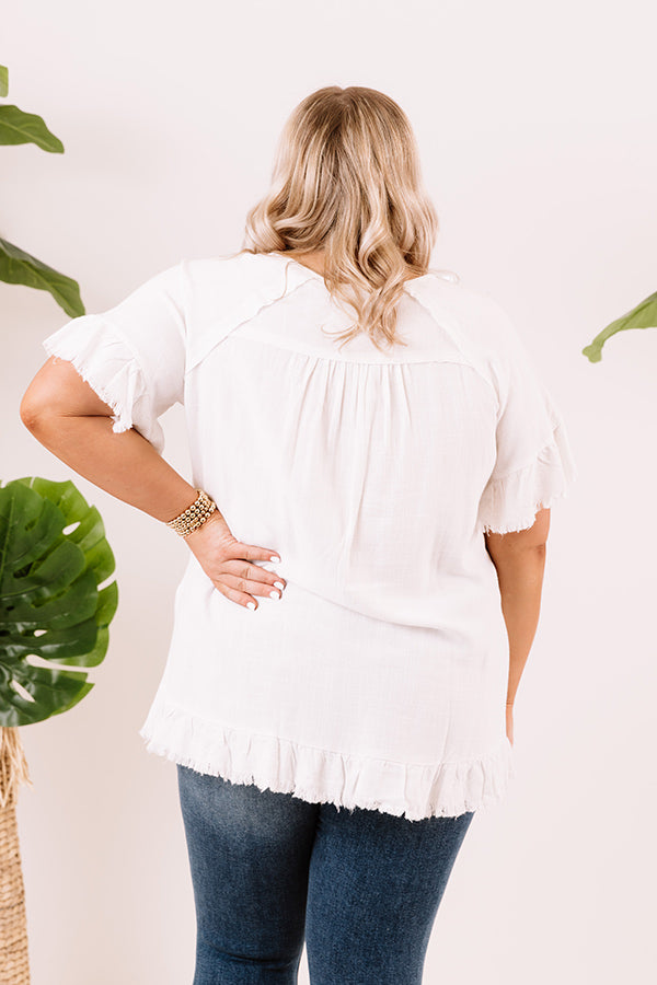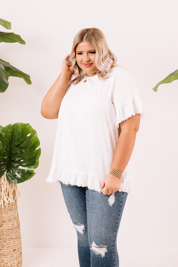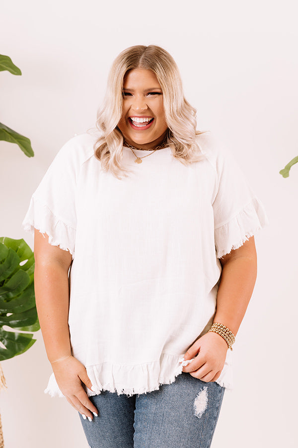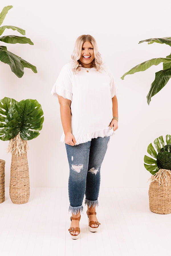 Plus Size - Start transitioning to fall in style with our adorable white 'S'more Kisses Shift Top' featuring lightweight material, a high rounded neckline, short loose sleeves with flared ruffle cuffs, exposed accents seams, raw-cut trim detailing, and a relaxed silhouette that falls into a ruffled hemline! Measurements