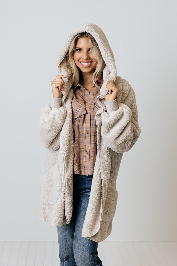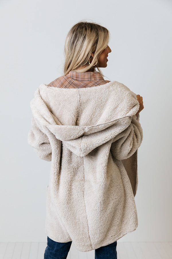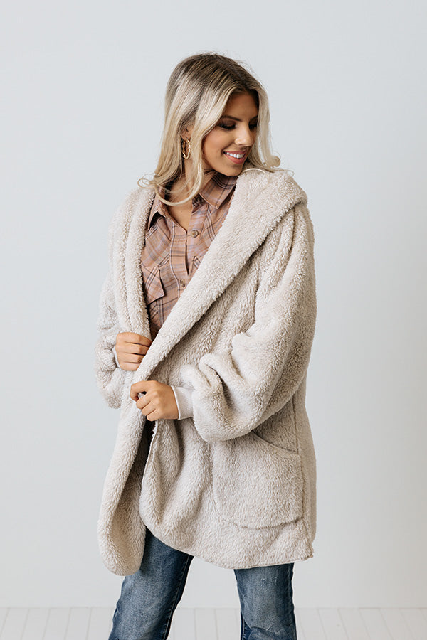 Cozy up on those chilly fall days in this comfy cute stone hued cardigan featuring soft and thick teddy material, long loose sleeves, low side pockets, a draped collar, and a relaxed open front silhouette that falls into a straight hemline! Measurements