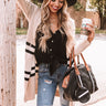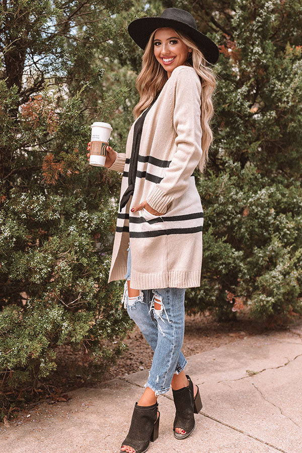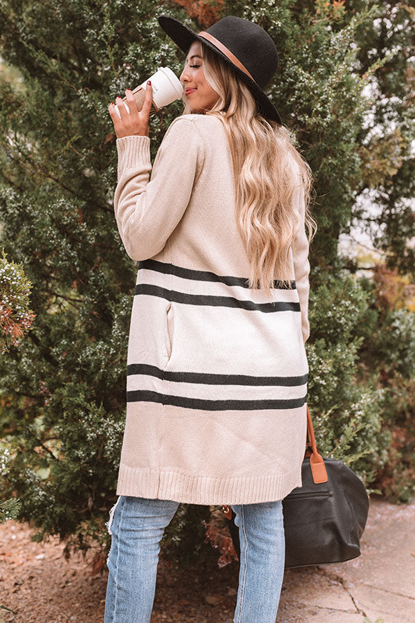 When it's warm for "s'mores and snuggles," stay warm in this cream colored cardigan featuring a soft lightweight material, black accent stripes, long loose sleeves with fitted cuffs, and an open front silhouette that falls into a knee-length straight ribbed hemline! You can style this versatile piece with just about anything from a basic tank to a sweater, jeans to dresses, wedges to sandals, clutches to totes, and hats to earrings! Measurements