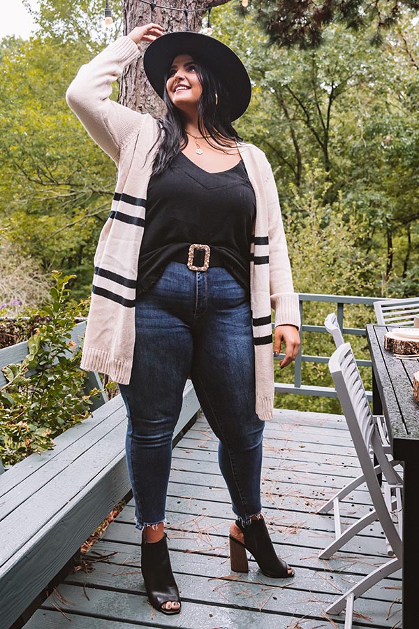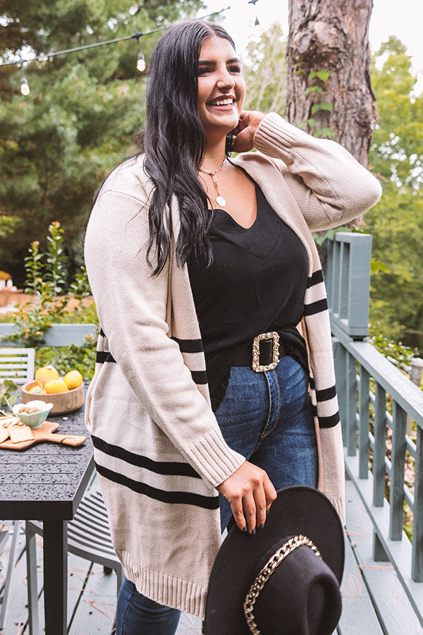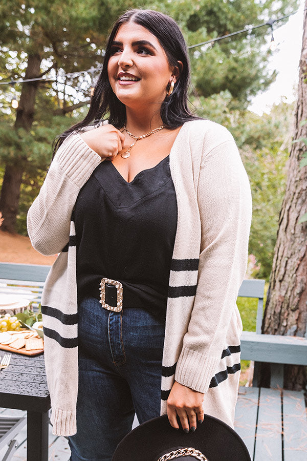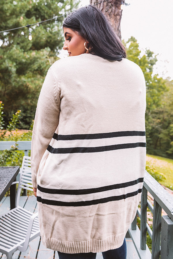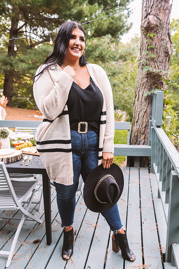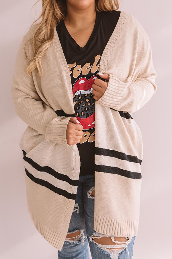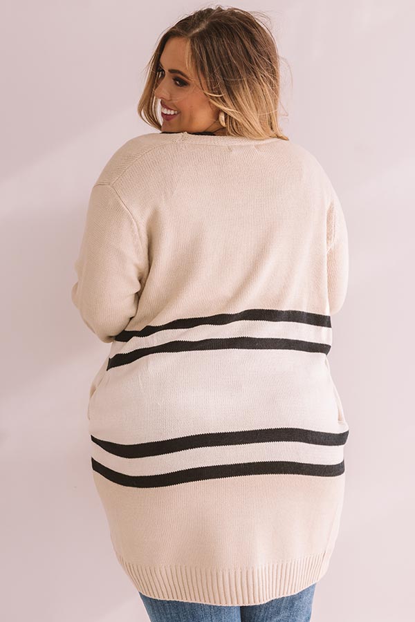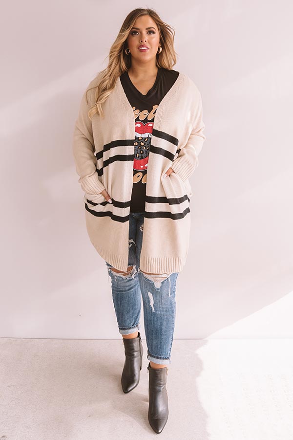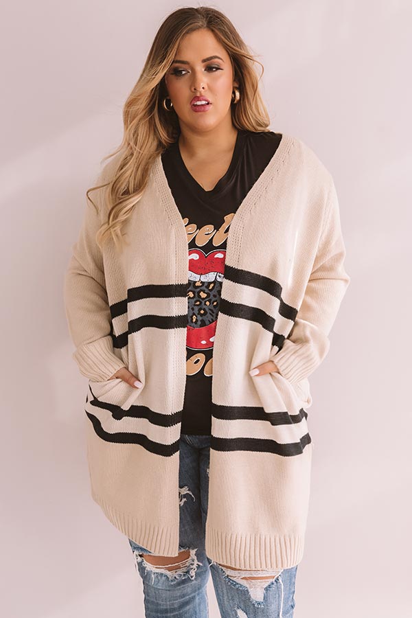 Plus Size - When it's warm for "s'mores and snuggles," stay warm in this cream colored cardigan featuring a soft lightweight material, black accent stripes, long loose sleeves with fitted cuffs, ribbed trim detailing, and an open front silhouette that falls into a straight knee-length hemline! You can style this versatile piece with just about anything from a basic tank to a sweater, jeans to dresses, wedges to sandals, clutches to totes, and hats to earrings! Measurements