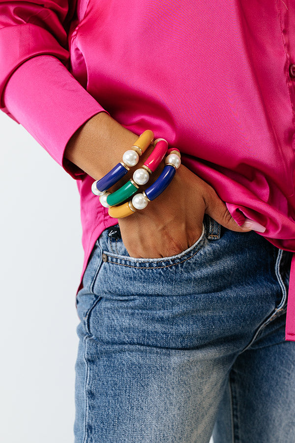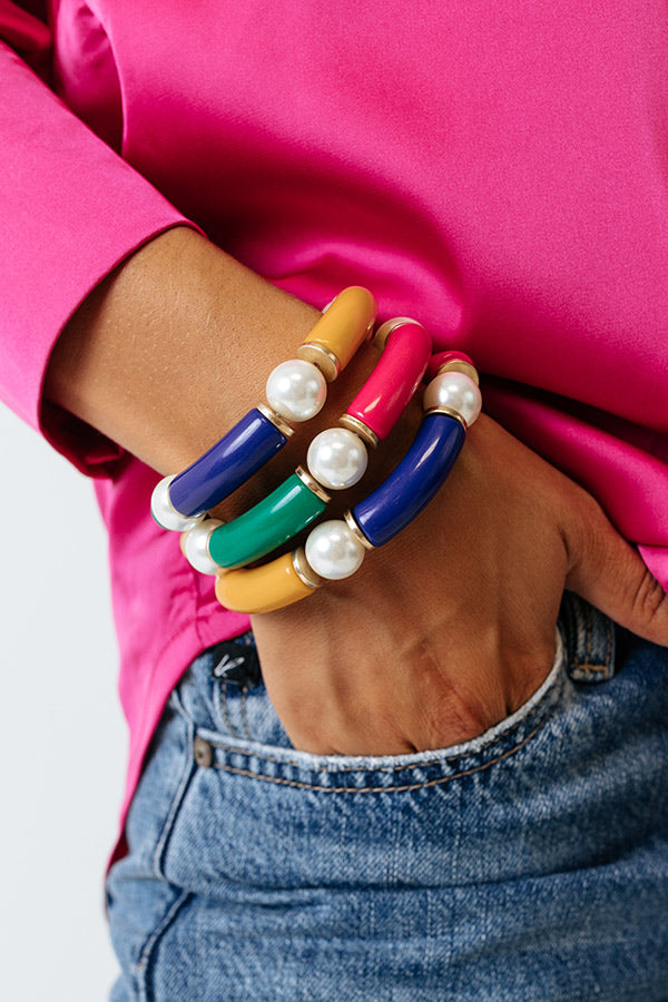 People are guaranteed to want to snap a photo of this stunning bracelet featuring a royal blue, mustard, green, and hot pink resin cylinder stretch strand with pearl accents! Each bracelet sold separately.