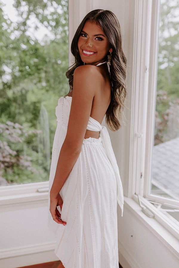 We have no doubt you will want to snap a photo in this ethereal white dress featuring lightweight material with subtle embroidered stripe detailing, a sweetheart neckline with a spaghetti strap halter tie, ruffle trim detailing, accent side cutouts, and a relaxed skirt silhouette that alls into a high/low mid-calf length hemline!