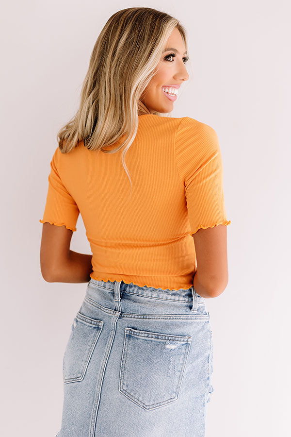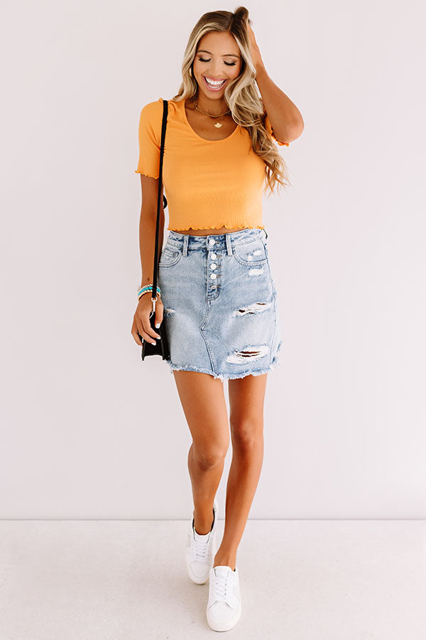 Keep it simple yet stylish in our chic yellow/orange hued "Snap Story" top featuring lightweight stretchy material with subtle ribbed texturing, dainty ruffle trim detailing, a high scooped neckline, short sleeves, and a form fitting silhouette that falls into a cropped hemline! We have paired this cutie with a distressed light wash denim skirt, trendy white sneakers, and a matching crossbody, but you can also wear it with some black flares, our "Floral Festivities Hair Scarf in Yellow," and "The Jess Faux Leather Heel in Natural!"