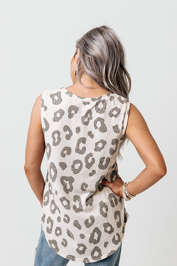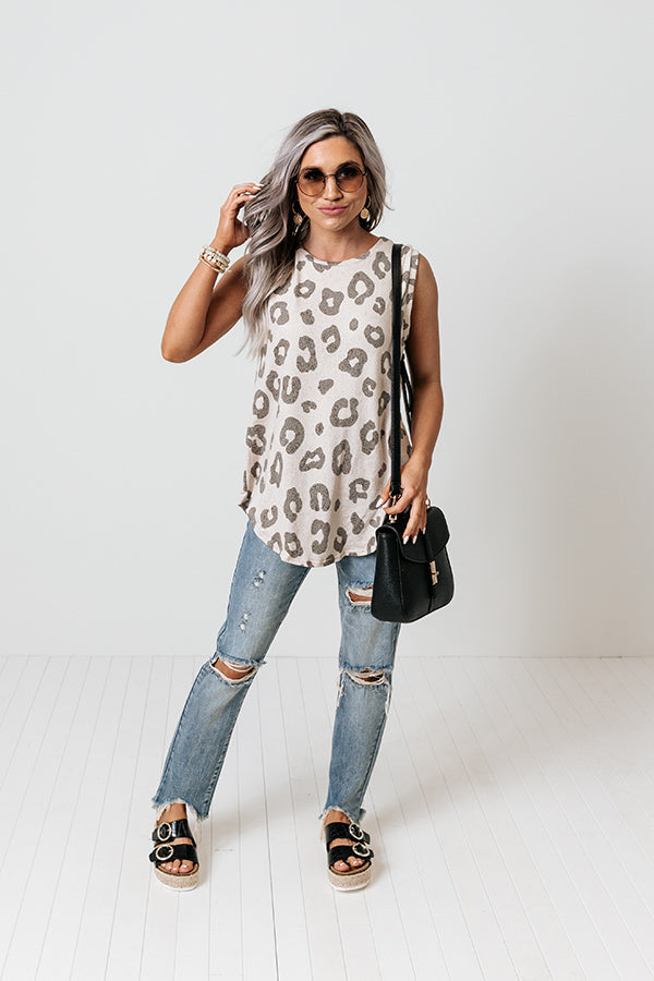 Let your wild side show with our casual cute birch hued 'Snorkel Season' shift top featuring soft lightweight and flowy material patterned with a large muted spotted leopard print, a high rounded neckline, wide sleeveless shoulders, and a slouched silhouette that ends in a rounded hemline! Measurements