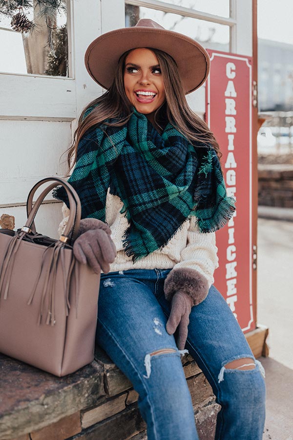 This trendy blanket scarf is "snow adorable" with its lightweight material, blue and green plaid pattern, and fringed edge detailing!