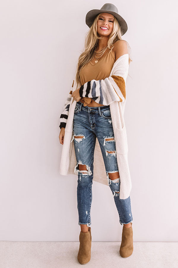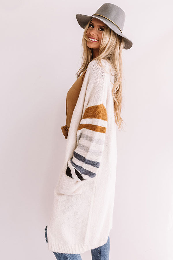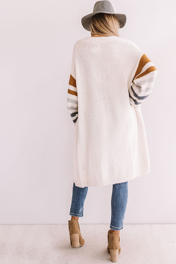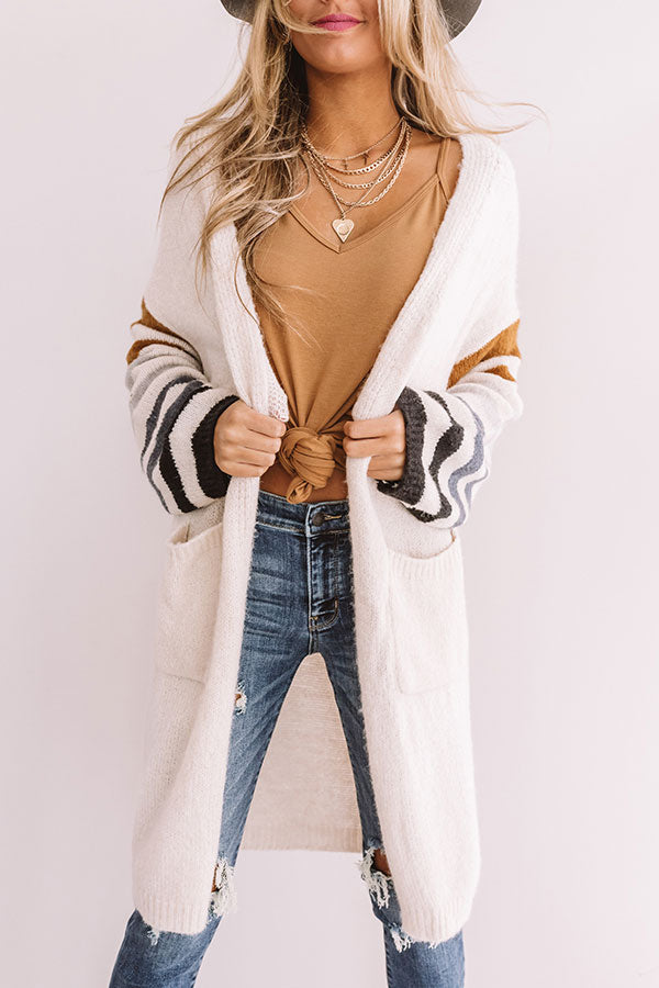 Stay warm and protected from those chilly snow kisses in this ivory hued cardigan featuring a stretchy tight knit material, long loose sleeves with fitted cuffs and striped detailing, two low accent pockets, and a relaxed open front silhouette that falls into a straight mid-thigh length hemline! You can style this versatile piece with just about anything from a basic tank to a sweater, jeans to dresses, wedges to sandals, clutches to totes, and hats to earrings! Measurements