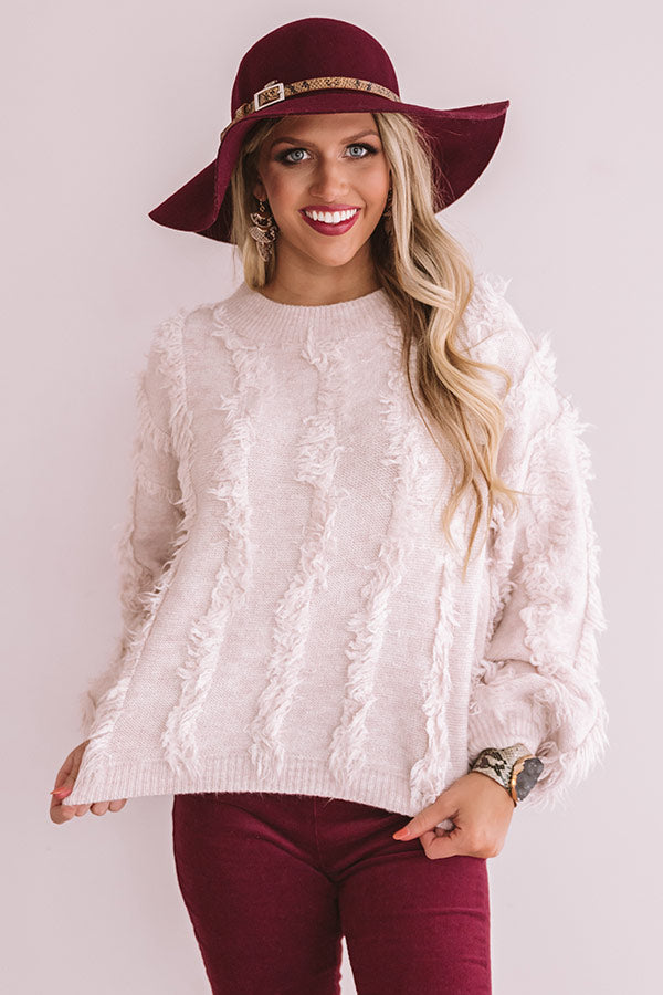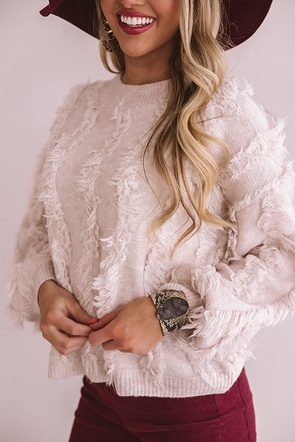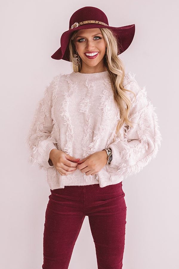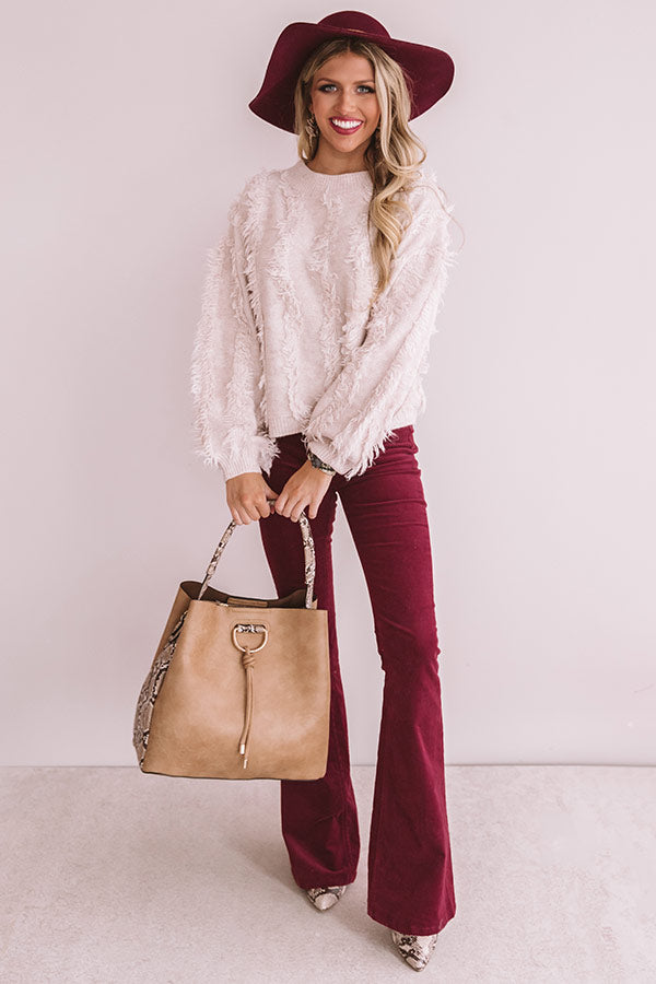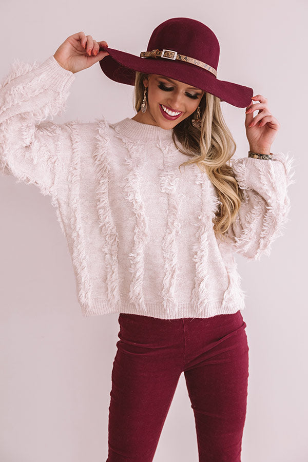 There is no better piece to walk through a winter wonderland in than this adorable ivory colored "Snow Angel" sweater featuring ultra soft lightweight material with fringed textured stripes, ribbed trim detailing, a high rounded neckline, long loose sleeves with fitted cuffs, and a relaxed silhouette that falls into a straight hemline! We have styled this cold weather cutie with some wine flares, a matching faux suede hat, and a snake print bootie and tote, but you can also wear it with some distressed ankle skinnies and "The Jess Faux Leather Heel in Natural!"