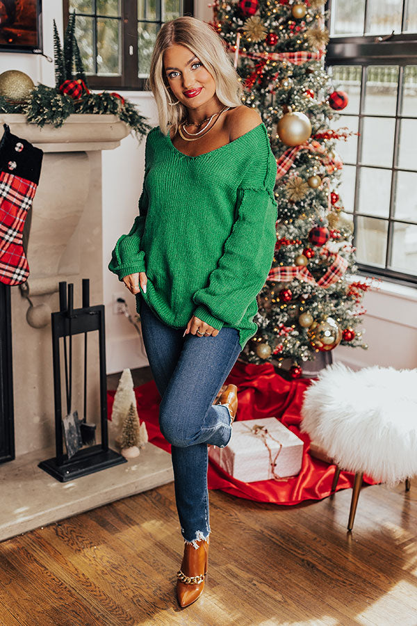 Don't hesitate to add this winter classic to your cart! Our cute green 'Snow Day in LA' sweater features soft knit material, a scooped neckline that can be worn off one shoulder, long loose sleeves with fitted cuffs, and a slouched silhouette that falls into a straight hemline! Measurements