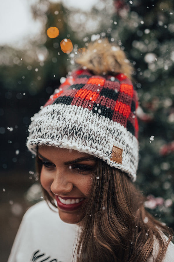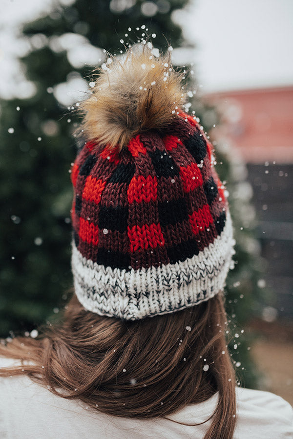 Stay warm on those chilly "snow days" with this adorable beanie featuring soft and stretchy loose knit material, a red and black checkered pattern with a black and white hemline, and a faux fur pom accent!