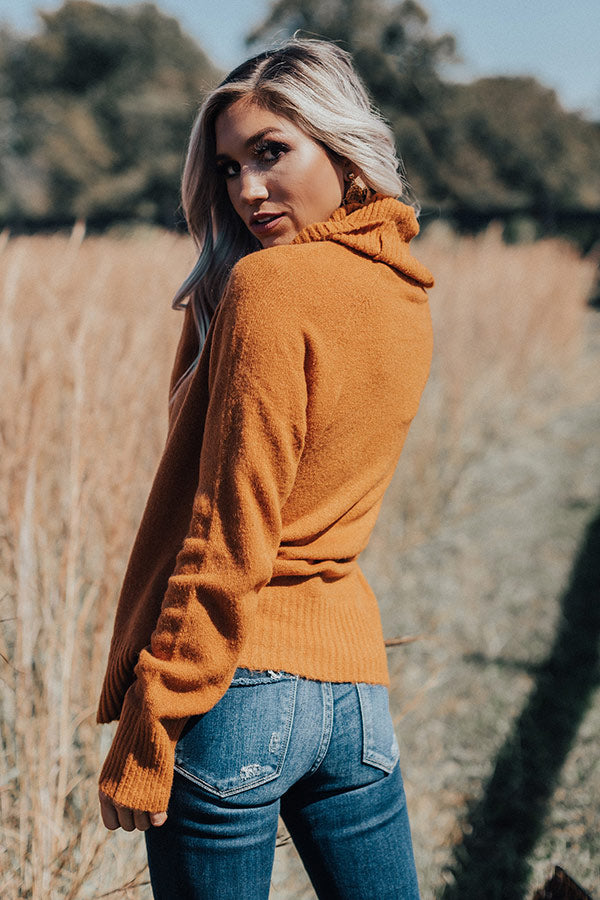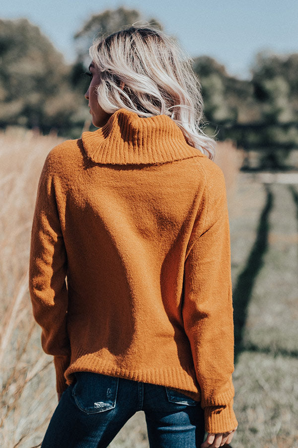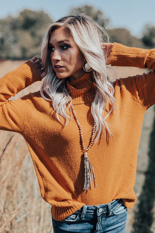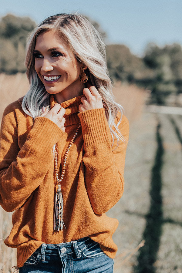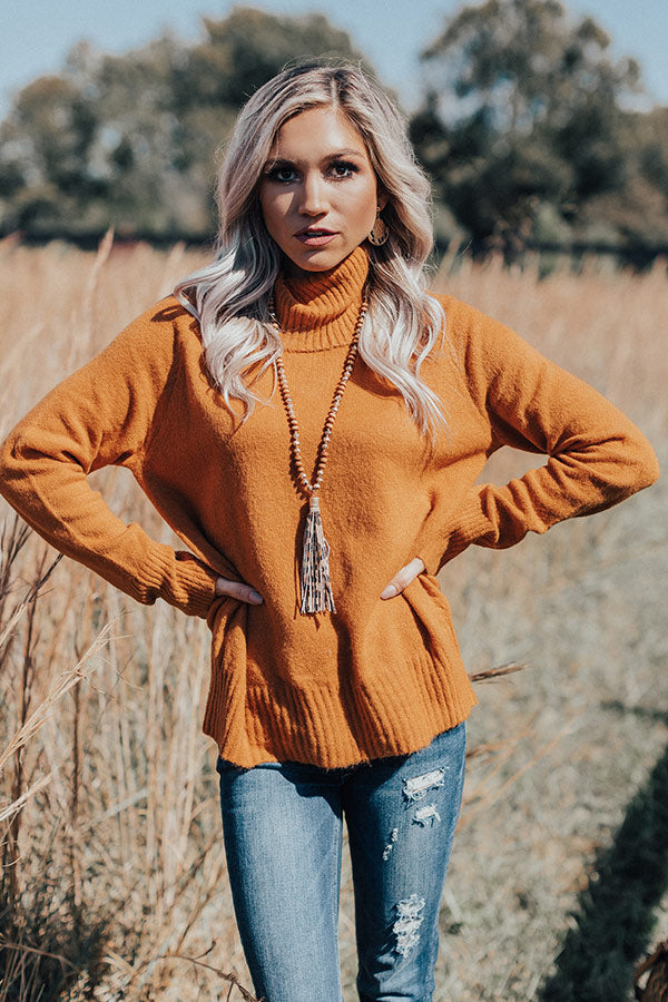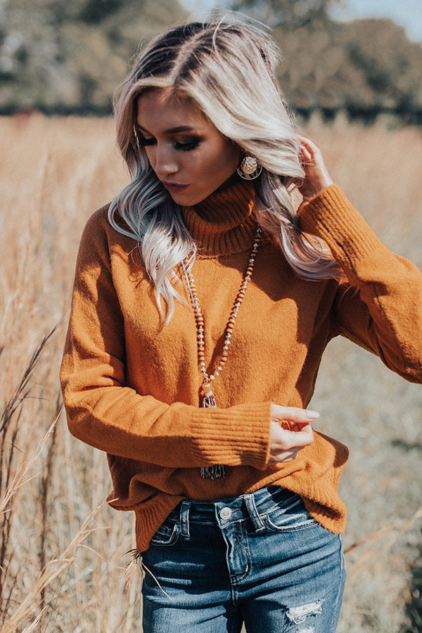 Stay warm and protected from the chilly "snow in Soho" with this charming pumpkin colored shift sweater featuring sot lightweight material with subtle texturing, ribbed trim detailing, a high turtle neckline, long loose sleeves with fitted cuffs, and a relaxed silhouette that falls into a straight hemline! We have styled this cold weather essential with some distressed ankle skinnies and a statement necklace, but you can also wear it under an ivory sherpa vest with some black flares, "The Jess Faux Leather Heel in Natural," and a neutral bootie and faux suede hat! Measurements