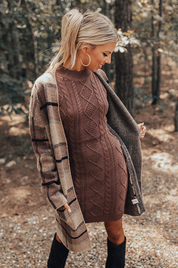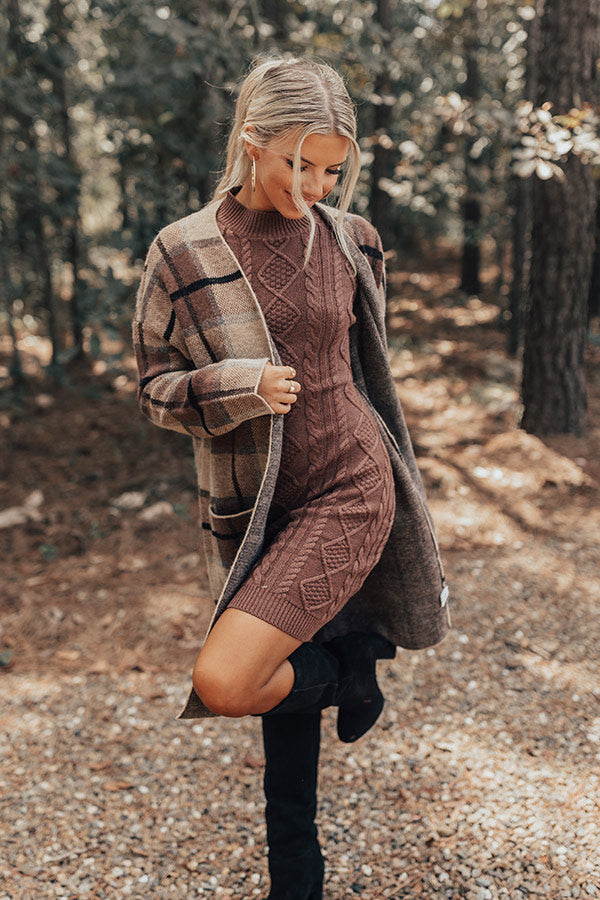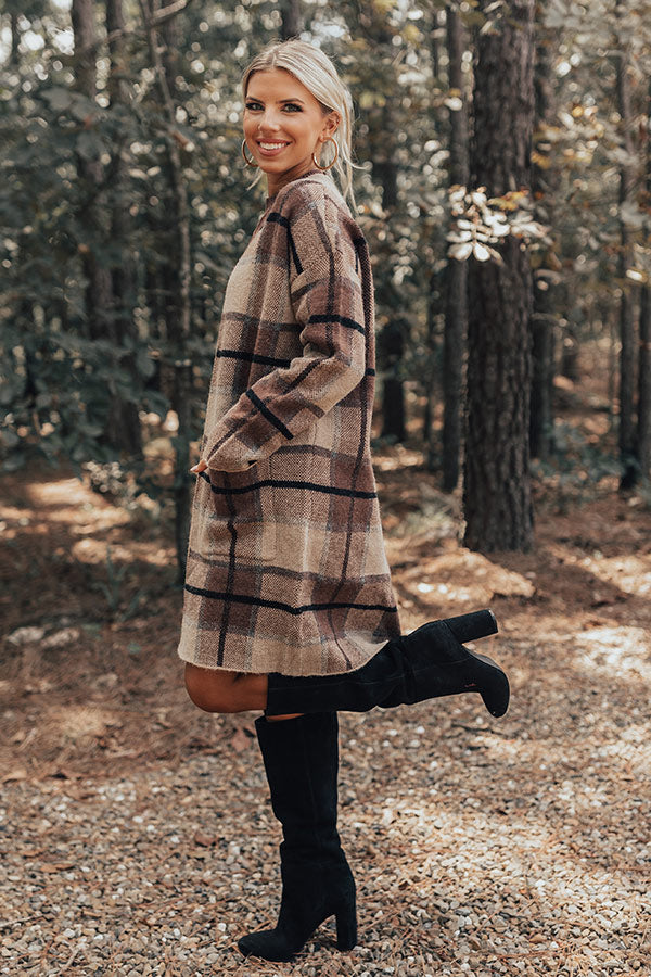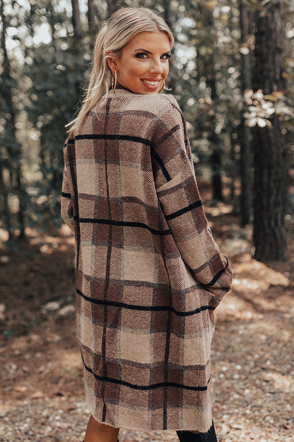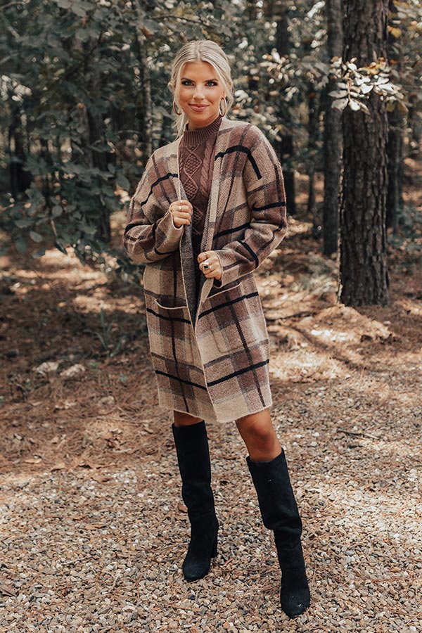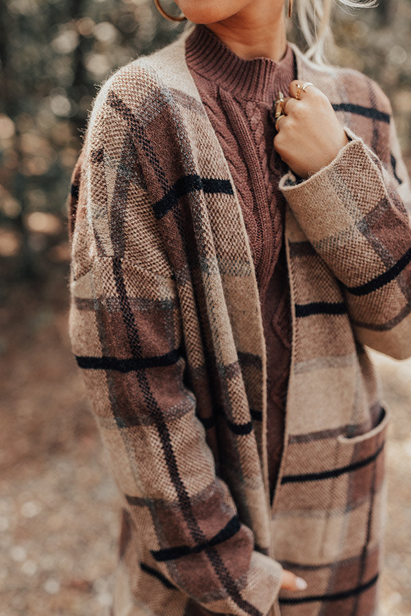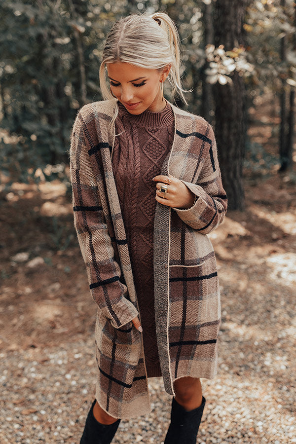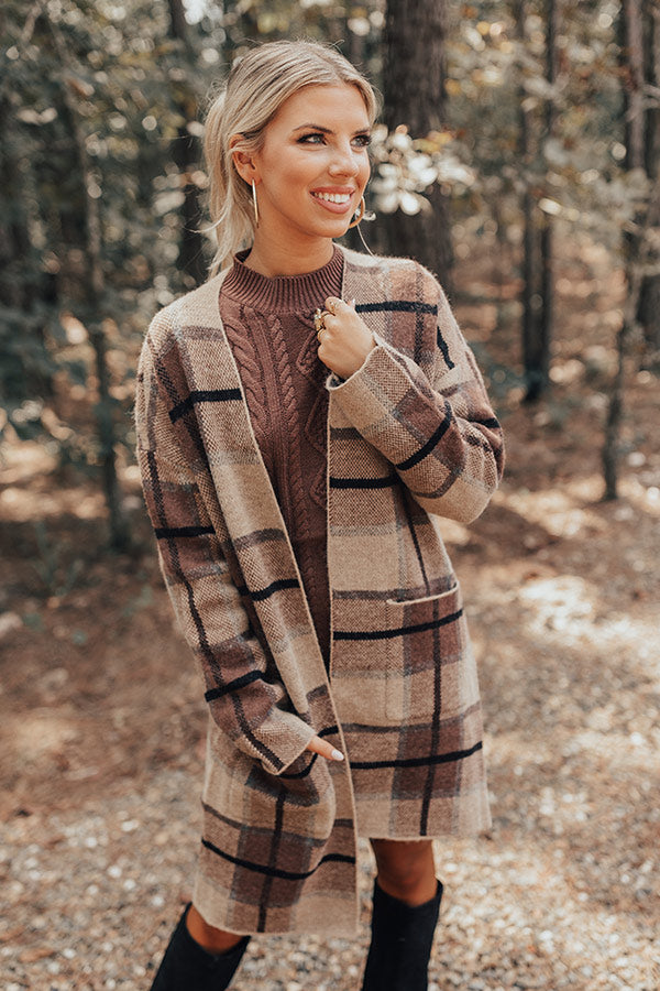Keep warm all fall long in our pretty tan hued 'Snow I West Village Cardigan' featuring soft knit material patterned with a brown and black plaid print, long loose sleeves, low accent pockets, and a draped open front silhouette that falls into a straight lower-thigh length hemline! Measurements