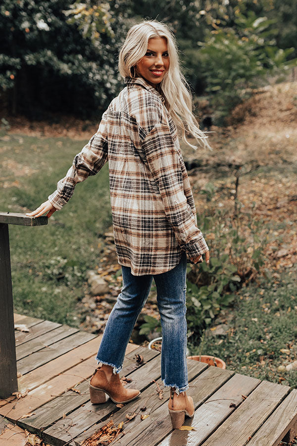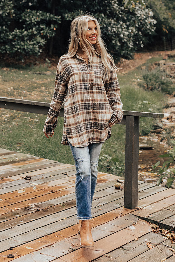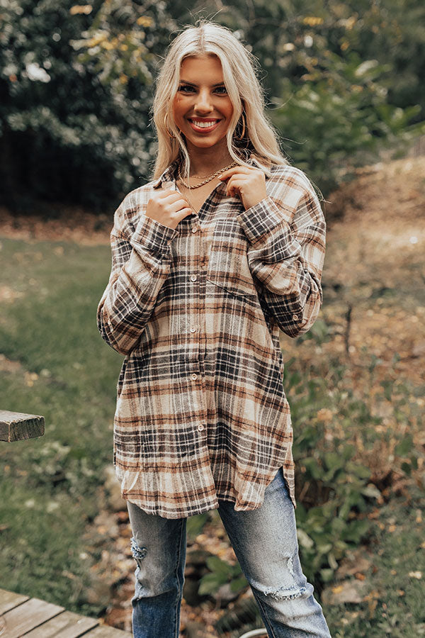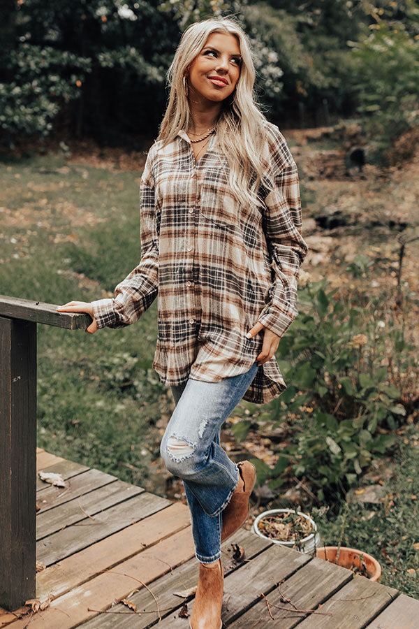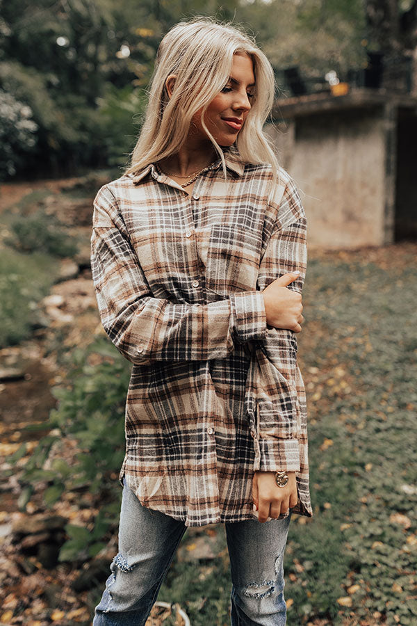 Welcome the colder weather in style with our adorable 'Snow In West Village Flannel' featuring lightweight but warm material patterned with a charcoal and brown plaid print, a button down front with a collared neckline, long loose sleeves with button closure cuffs, a single accent chest pocket, and a relaxed silhouette that falls into a rounded hemline! Measurements