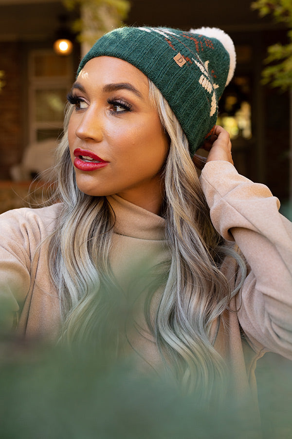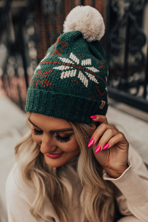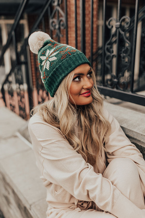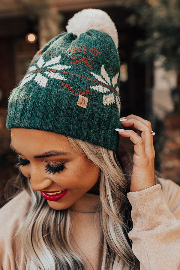 Keep warm from your head to your toes with our adorable dark green 'Snow Melt' beanie featuring ultra soft and stretchy knit material with a cute white and red winter pattern, ribbed trim detailing, and an accent faux fur pom pom!