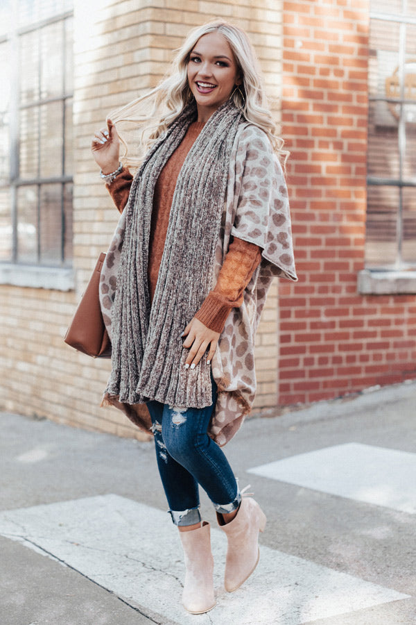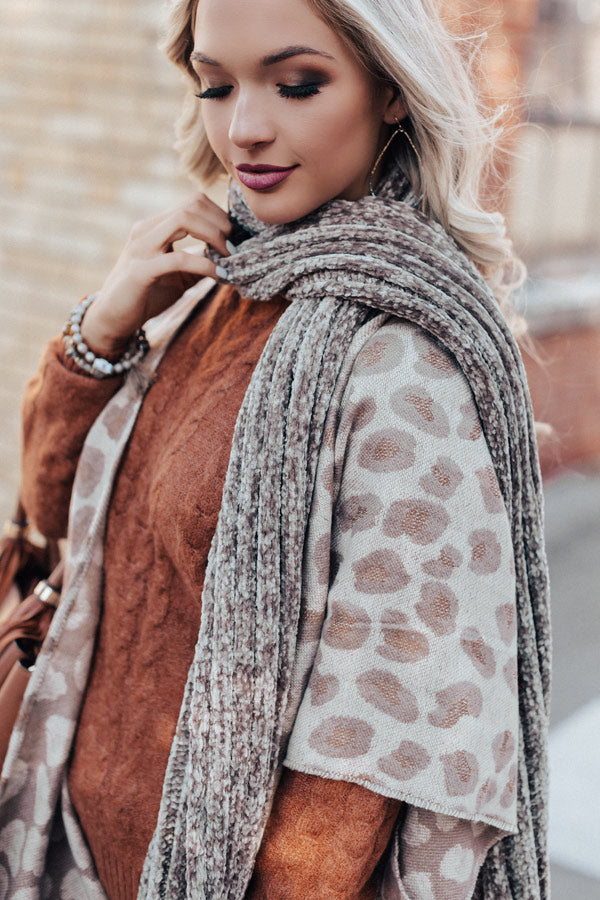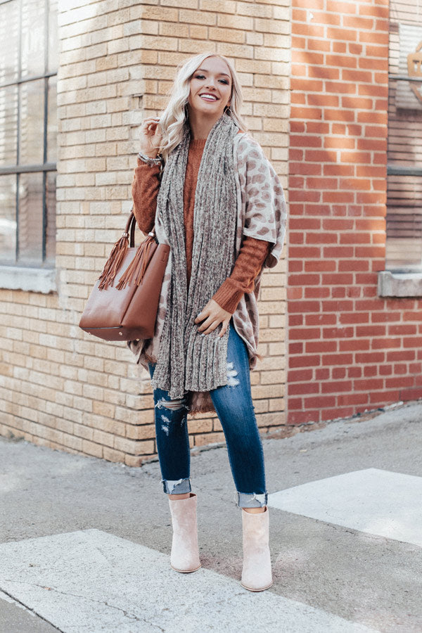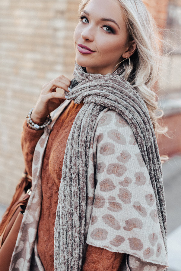 When packing for your "snow retreat," don't forget to toss this ultra warm taupe colored scarf in your suitcase with its soft and stretchy lightweight chenille material and wide ribbed texturing!