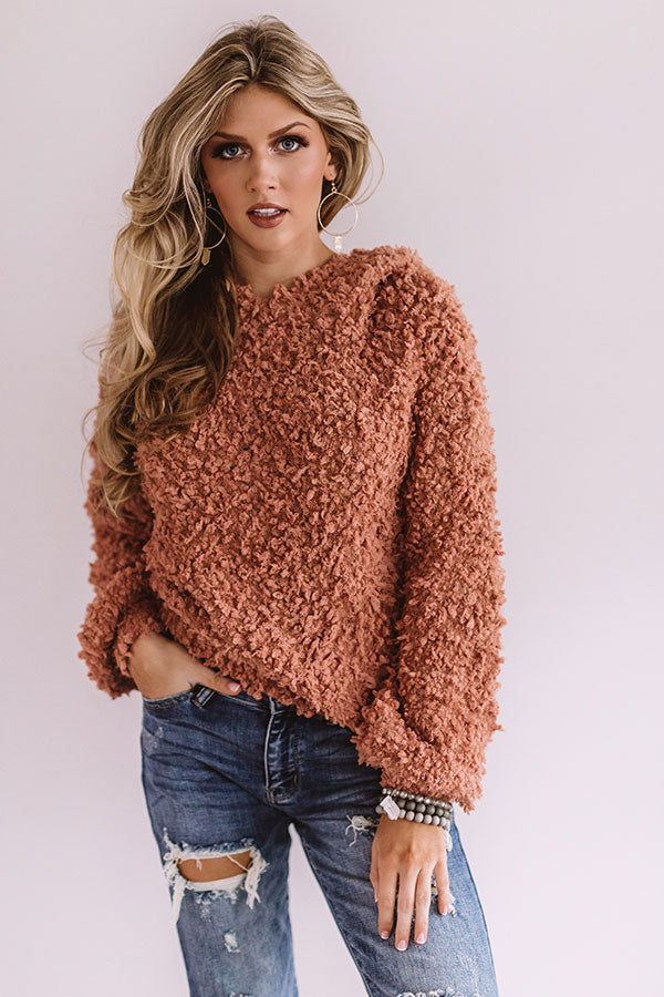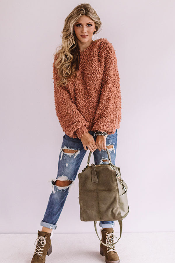 When packing for your "snow retreat," don't forget to toss this adorable and warm light rust colored hoodie in your suitcase with its soft lightweight popcorn knit material, ribbed trim texturing, long oversized bishop sleeves with fitted cuffs, a hooded back, and relaxed silhouette that falls into a straight hemline! We have styled this piece with some distressed ankle skinnies, chic combat boots, and a trendy backpack, but you can also wear it with some charcoal flares, "The Seraphina Faux Leather Wedge in Grey," and our "All Caught Up Headband in Grey!"