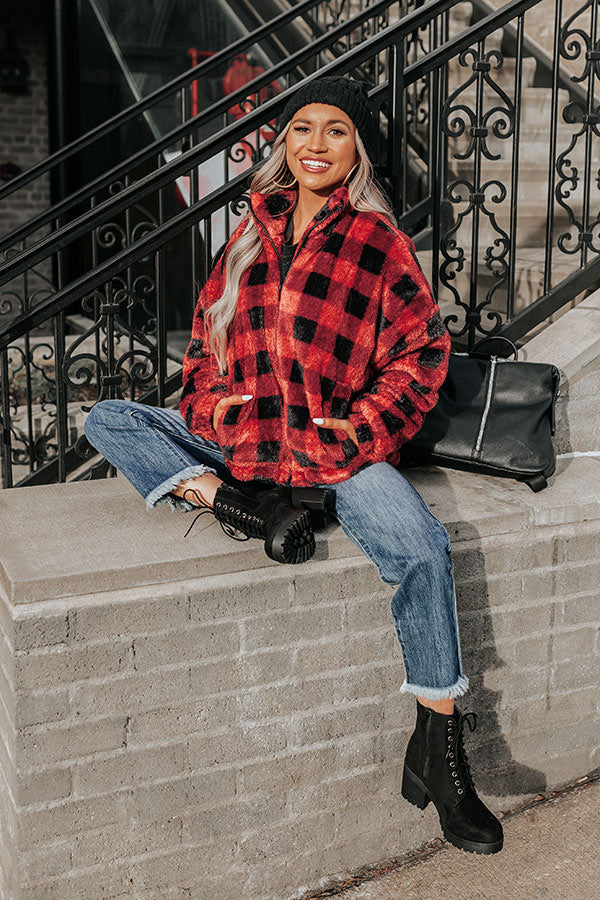 There is no better way to stay protected from the winter weather than with our adorable 'Snow Ski' jacket featuring ultra soft and thick plush material patterned with a black and red checkered print, long loose sleeves with more fitted cuffs, accent side pockets, a zip-up front silhouette with a collared neckline, and a flattering silhouette that ends in a straight hemline!