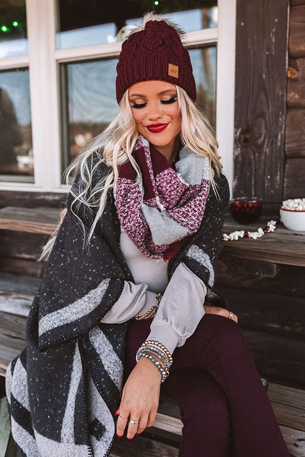 Keep warm during the chilly winter weather with our charming 'Snow Ski' scarf featuring soft lightweight but warm material patterned with a large grey and merlot colored plaid print and an infinity silhouette!
