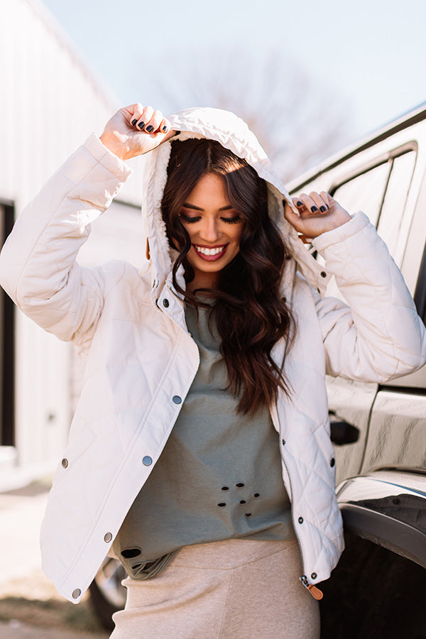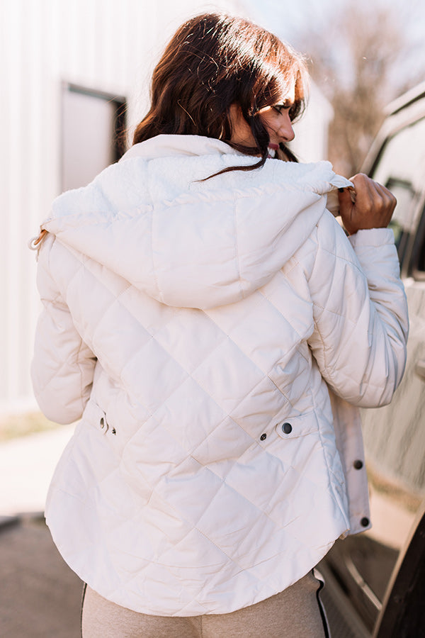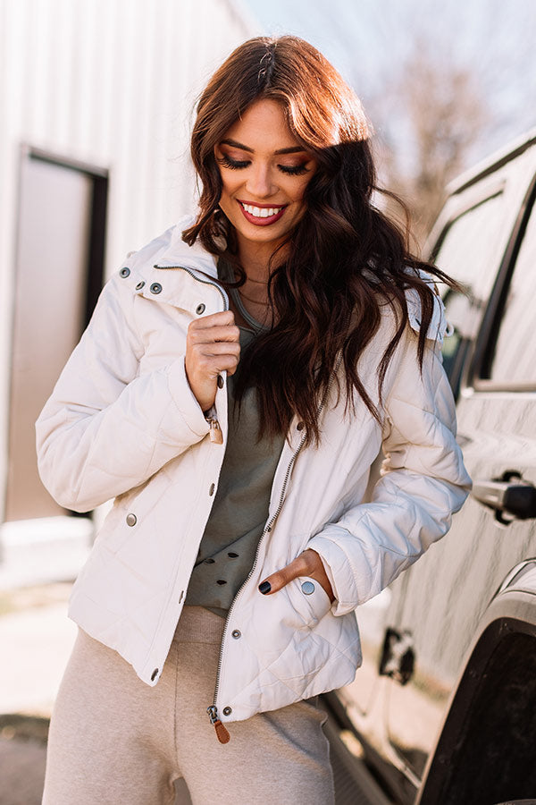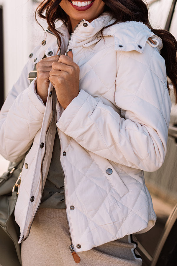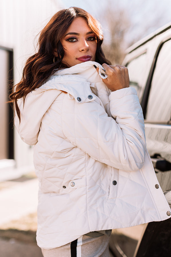 Keep warm and protected from those chilly winter snow storms with this adorable ivory colored jacket featuring thick quilted material, long loose sleeves, accent side pockets, a zip and snap button front closure, a hooded back with ultra soft lining, and a flattering silhouette that ends in a straight hemline! Measurements