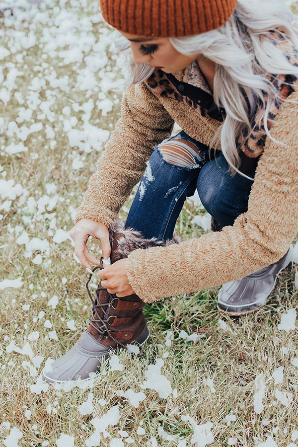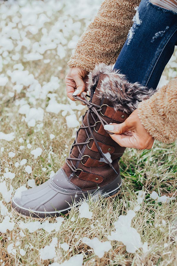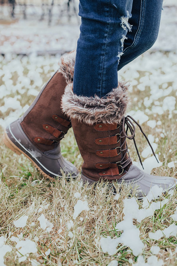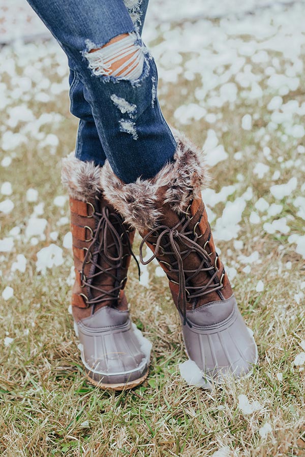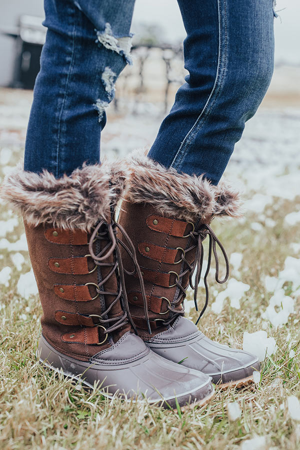 Stay looking fabulous and warm in the snow by wearing these adorable brown boots featuring sleek rubber soles, rounded closed toes, a high mid-calf lace-up silhouette, and faux fur trim!