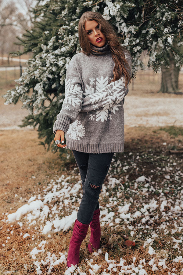 Stay looking fabulous and warm in the snow by wearing this adorable grey shift sweater featuring soft lightweight tight knit material with a large white snowflake pattern, ribbed trim detailing, a high rolled turtle neckline, long loose sleeves with fitted cuffs, and a relaxed silhouette that falls into a straight tunic length hemline! We have styled this cold weather essential with some distressed black skinnies and a wine colored boot and tote, but you can also wear it with some light wash denim flares, "The Seraphina Faux Leather Wedge in Grey," and our "Starry Skies Knit Beanie in Ivory!" Measurements