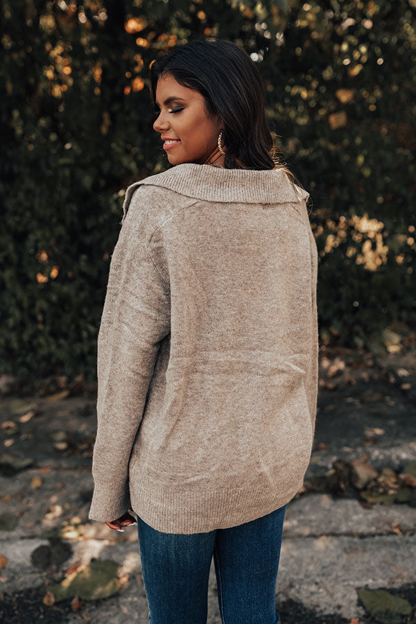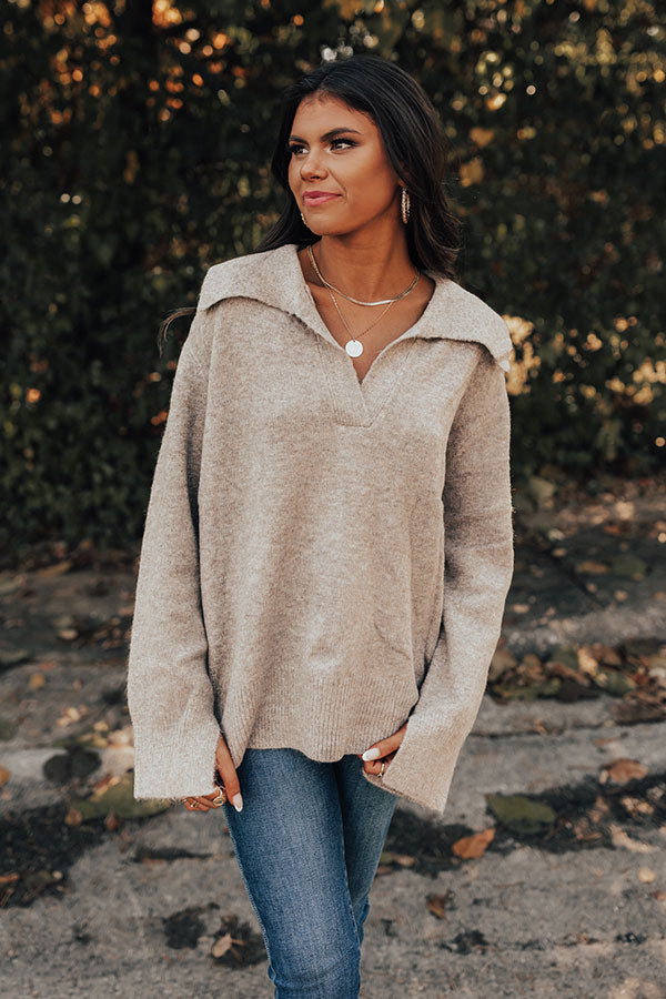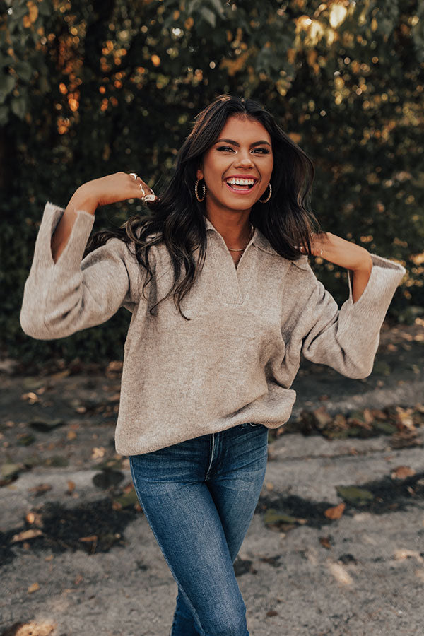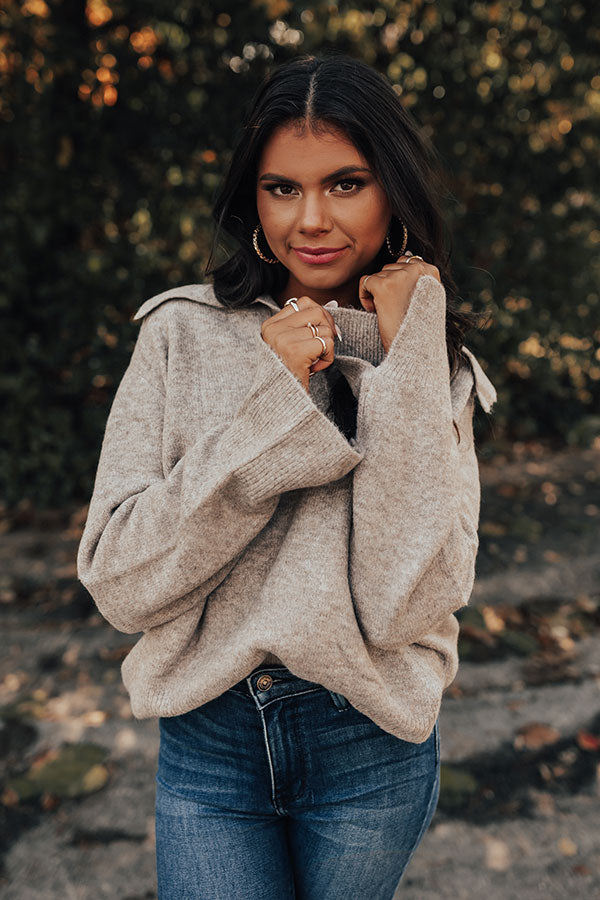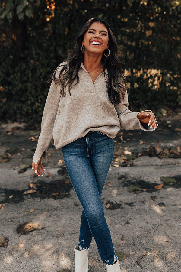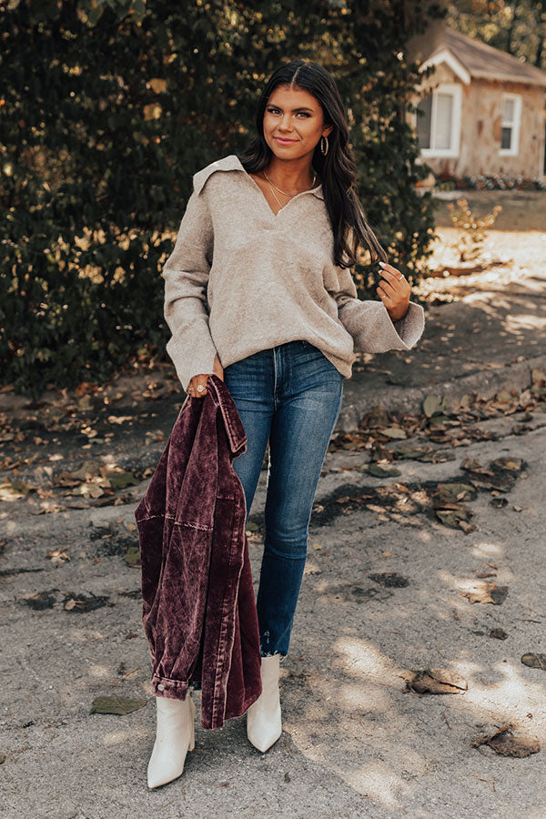 Feel cozy and cuddly in our new 'Snowfall Feels Sweater in Birch'! Features a lightweight warm knit material, a v-cut collared neckline, long loose sleeves with accent slits on the cuffs, and a relaxed silhouette that falls into a straight hemline.