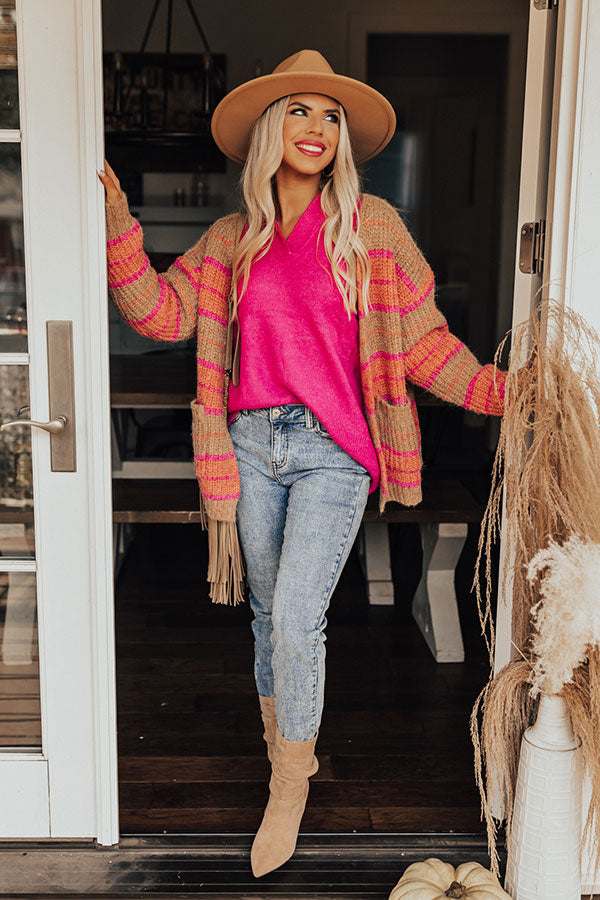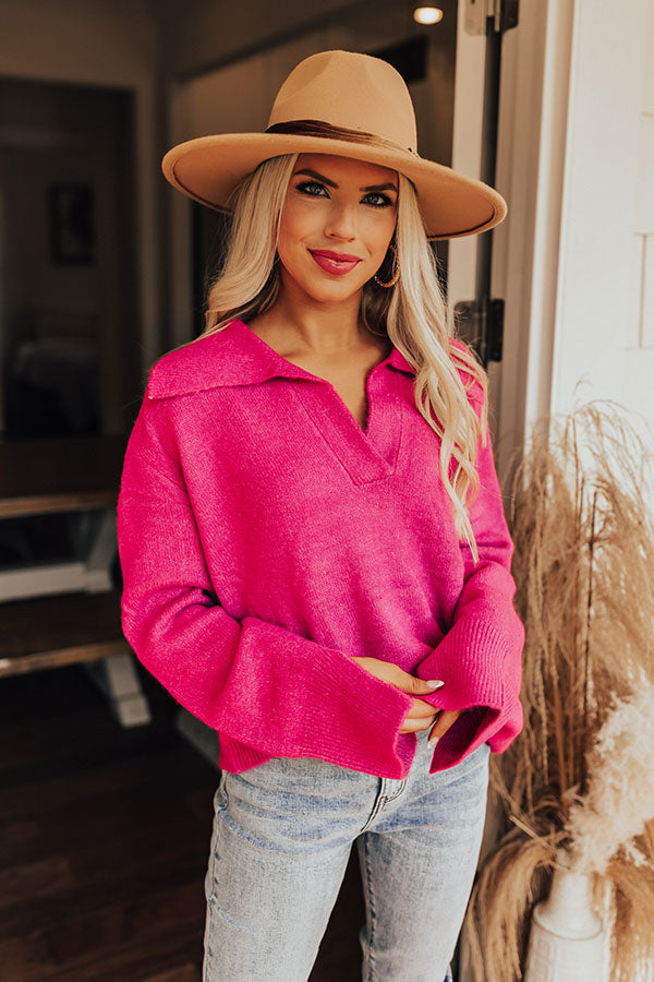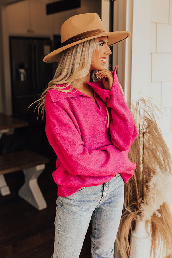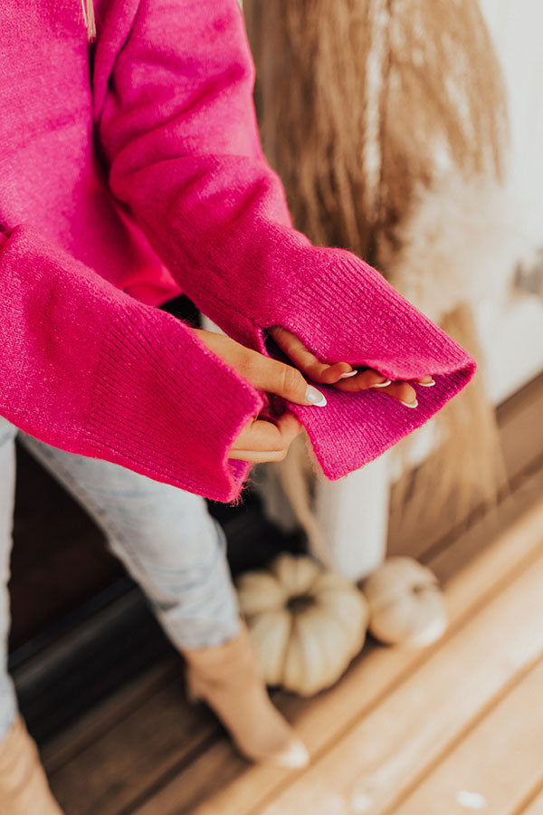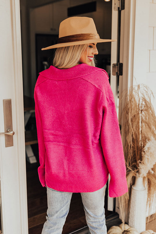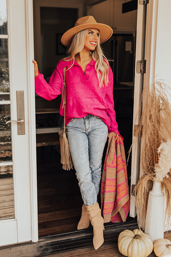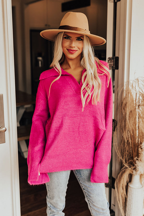 Feel cozy and cuddly in our new 'Snowfall Feels Sweater in Hot Pink'! Features a lightweight warm knit material, a v-cut collared neckline, long loose sleeves with accent slits on the cuffs, and a relaxed silhouette that falls into a straight hemline.