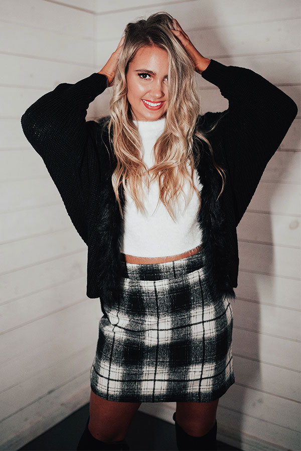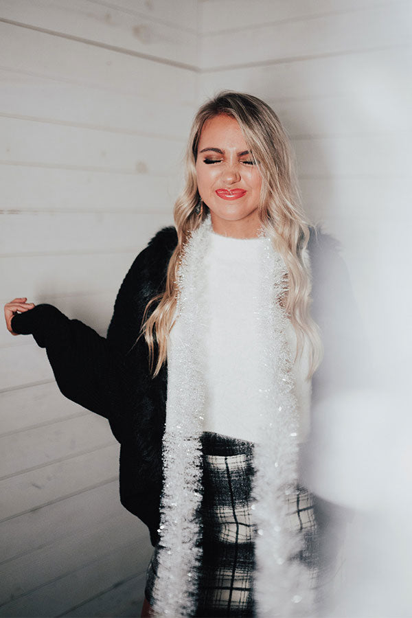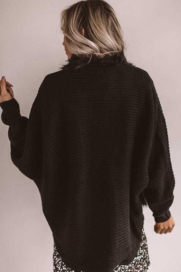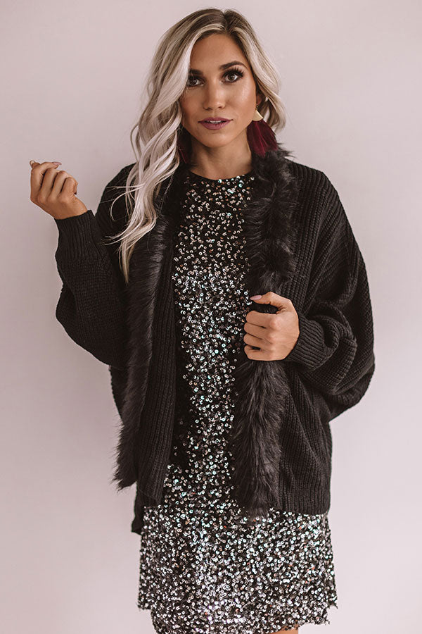 There is no better way to stay warm and protected from those chilly "snowflakes in Paris" than with this adorable black cardigan featuring soft lightweight tight knit material with ribbed texturing, faux fur trim detailing, long oversized sleeves with fitted cuffs, and a relaxed open front silhouette that falls into a rounded hemline! You can style this versatile piece with just about anything from a basic tank to a sweater, jeans to skirts or dresses, booties to wedges or sandals, clutches to totes, and hats to earrings! Measurements