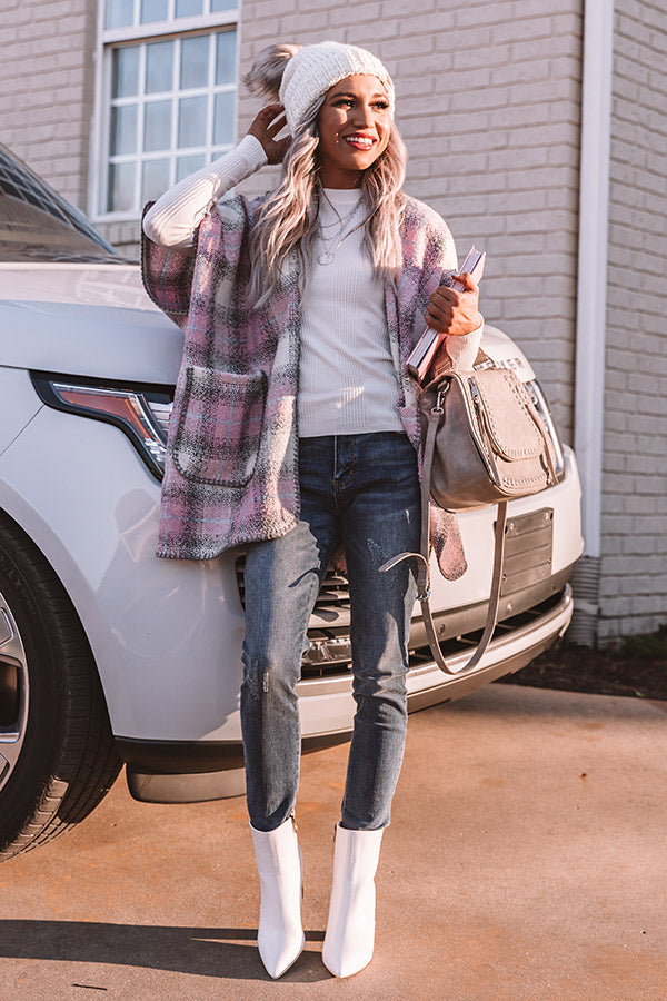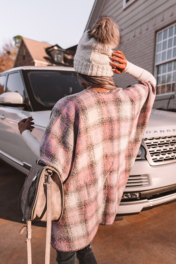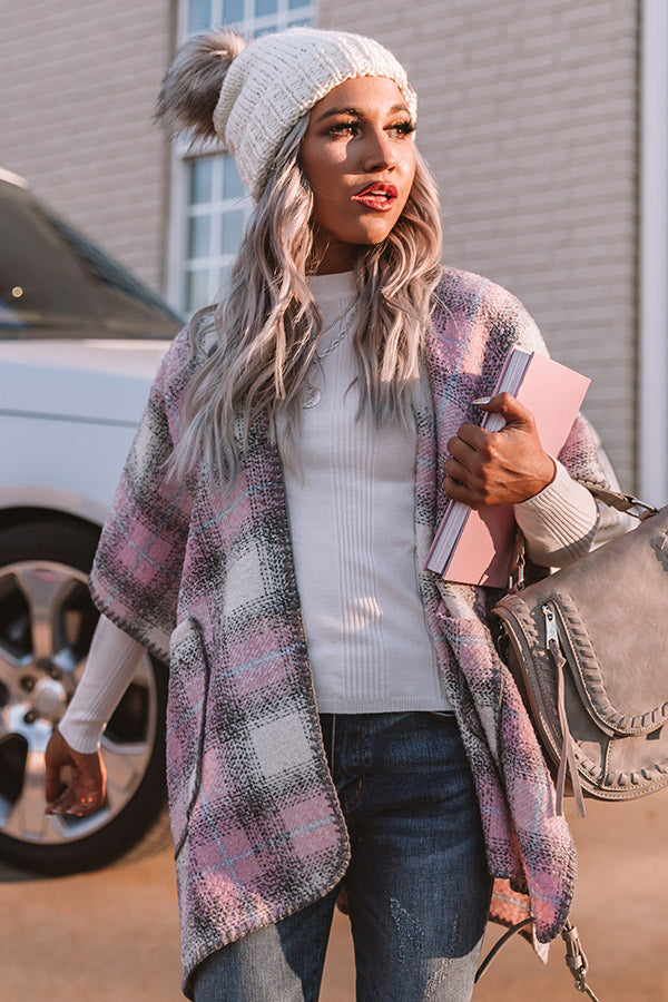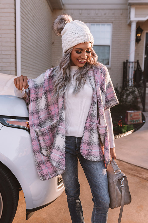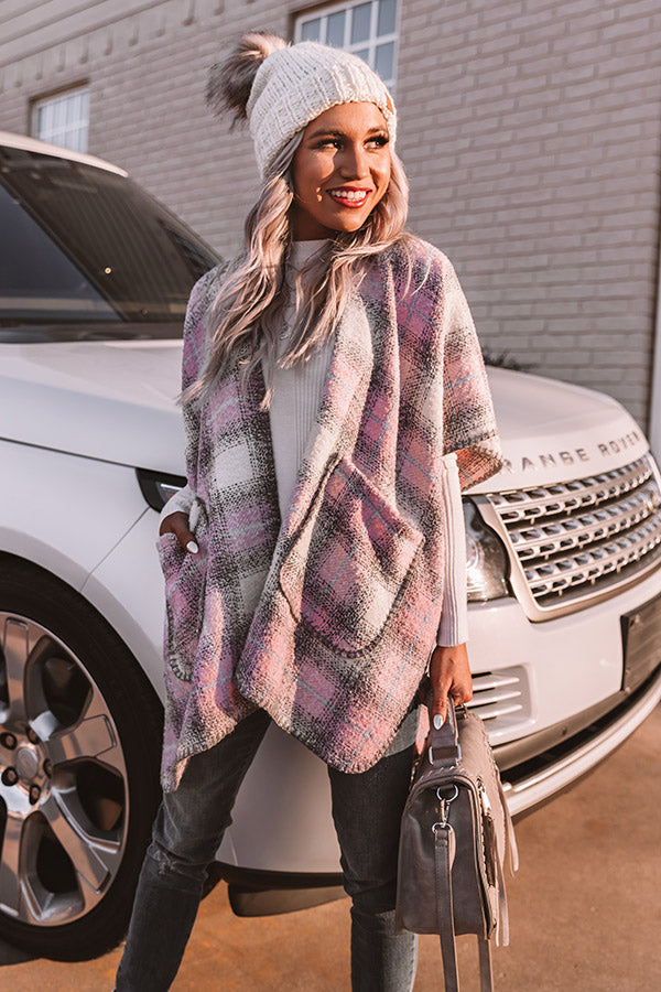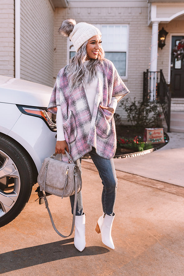 Celebrate winter in style with our charming 'Snowmass' poncho featuring soft lightweight material patterned with a large pink, grey, and white plaid print, oversized half sleeves, low accent pockets, and an ultra draped open front silhouette that falls into an uneven mid-thigh length hemline! Measurements