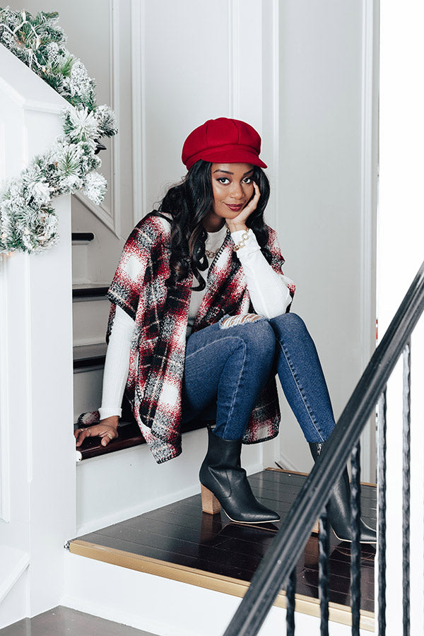 Celebrate winter in style with our charming 'Snowmass' poncho featuring soft lightweight material patterned with a large black, white, and red plaid print, oversized half sleeves, low accent pockets, and an ultra draped open front silhouette that falls into an uneven mid-thigh length hemline! Measurements