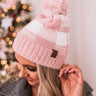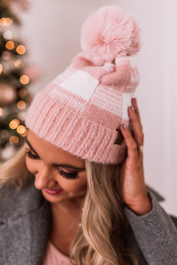 Top off your snowy Saturday with this adorable beanie featuring soft lightweight but warm tight knit material patterned with a pink and white buffalo check print, a rolled silhouette, and a pom accent!
