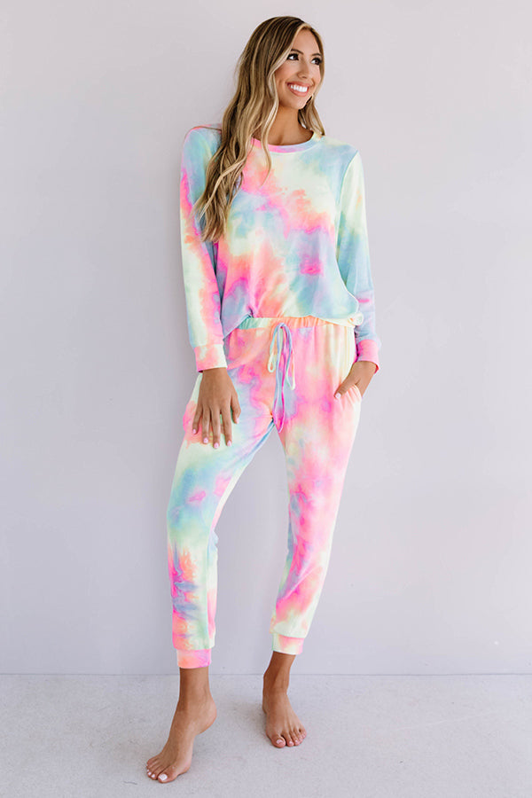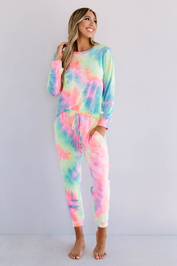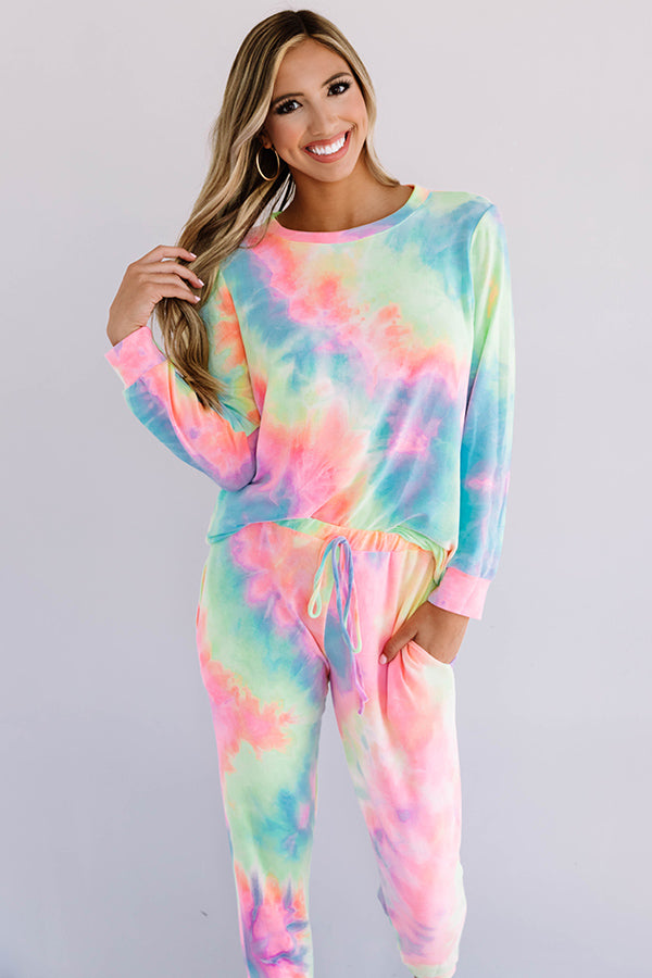 "Snuggle down" in style all weekend long with this trendy pink hued sweatshirt featuring soft lightweight material patterned with colorful tie dye, a high rounded neckline, long loose sleeves with fitted cuffs, and a relaxed silhouette that falls into a straight hemline! This comfy piece styles perfectly with our matching "Snuggle Down Tie Dye Joggers in Pink," a scrunchie, and some fuzzy slippers for the ultimate two-piece lounge look!