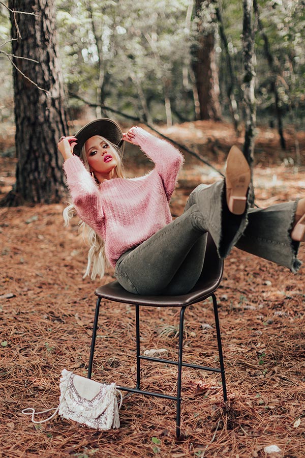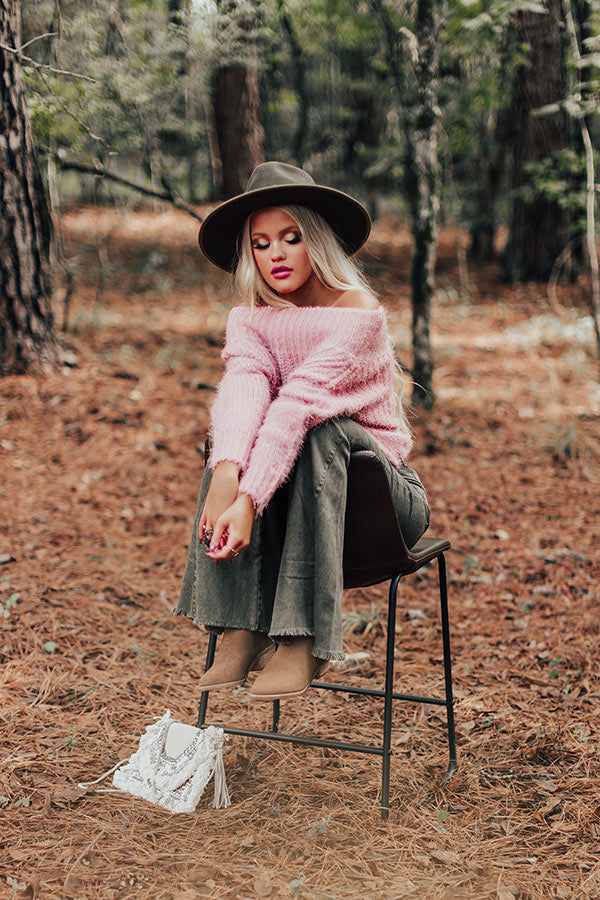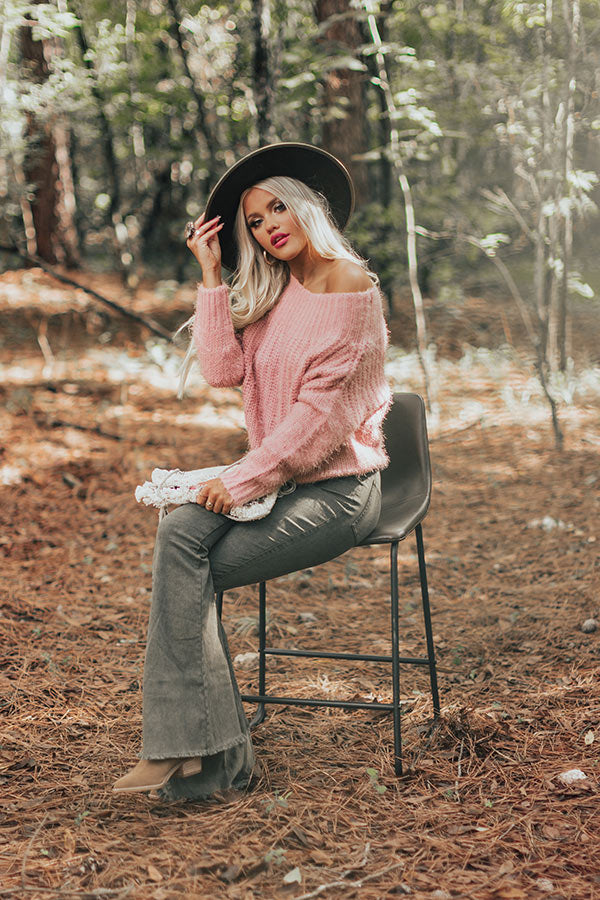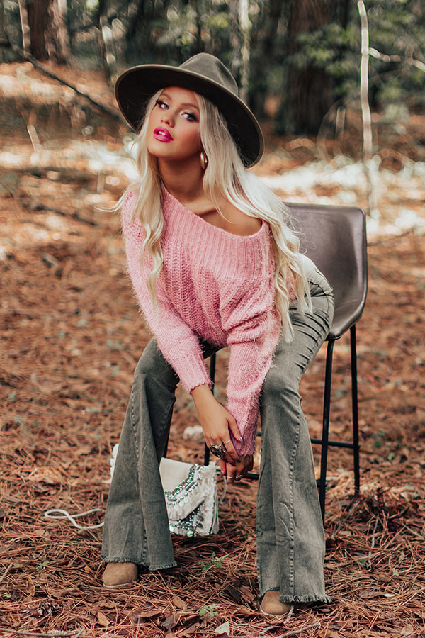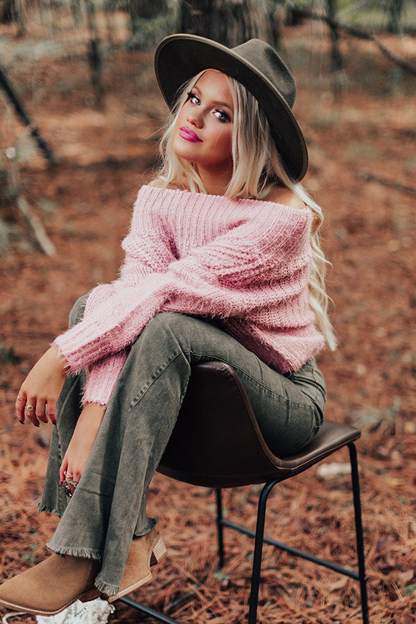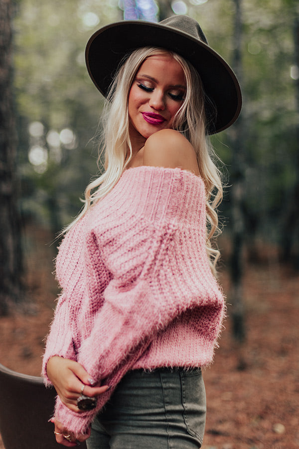 "Snuggle up" in this daring blush colored sweater featuring ultra soft and thick tight knit material with fuzzy texturing and ribbed detailing, an off-shoulder fit with a straight neckline, long oversized sleeves with fitted cuffs, and a slouched silhouette that falls into a straight hemline! Measurements