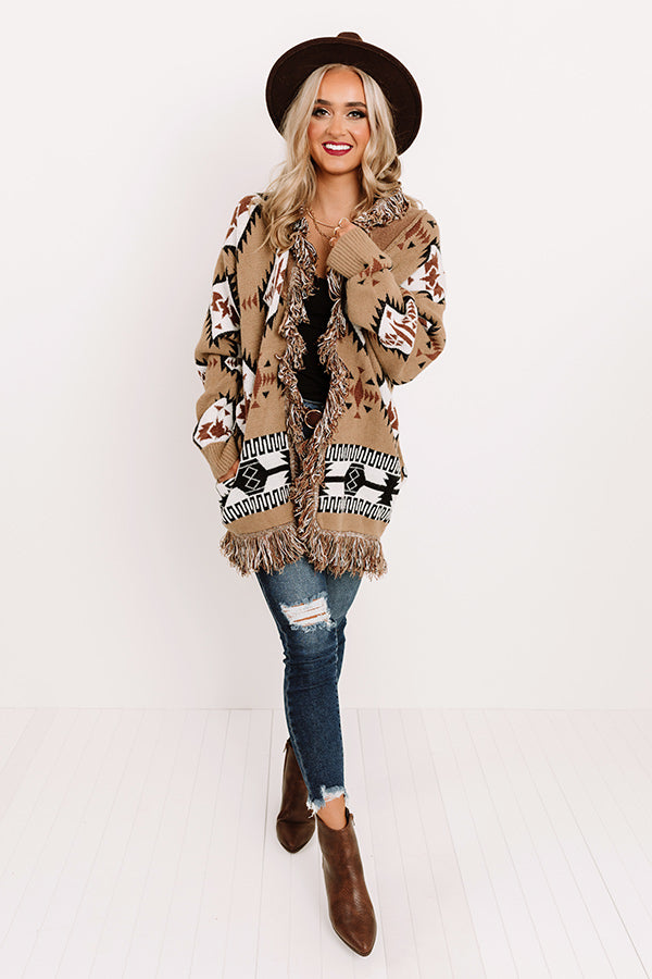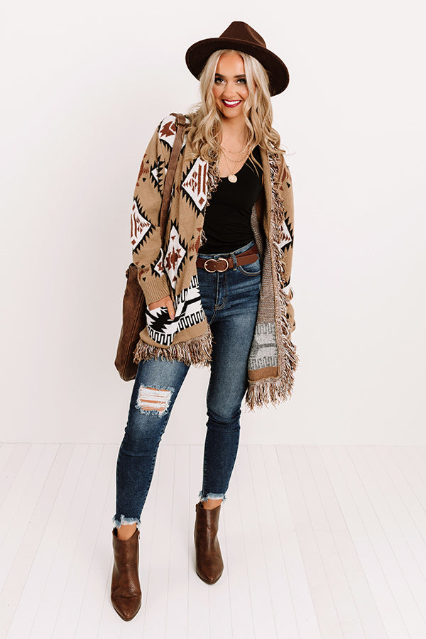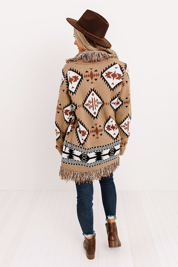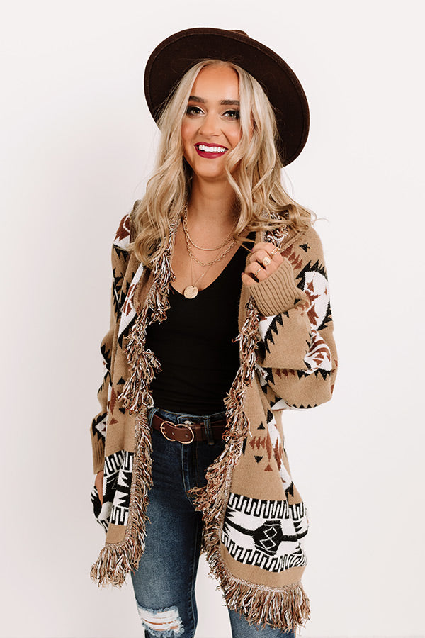 Get snuggled up with cocoa in this adorable khaki colored cardigan featuring ultra soft and thick tight knit material patterned with a white, black, and wine colored aztec print, long loose sleeves with fitted cuffs, fringed trim detailing, and a draped open front silhouette that ends in a straight upper-thigh length hemline! Measurements