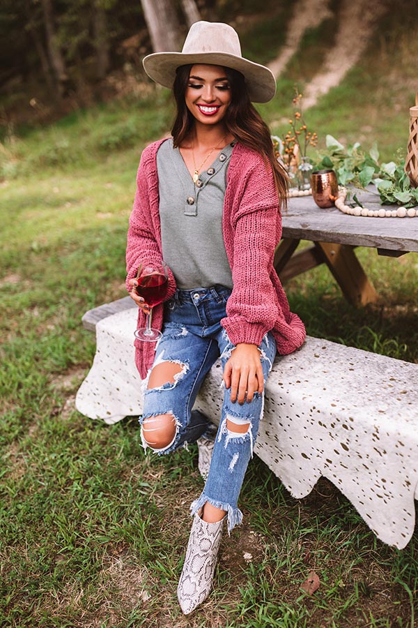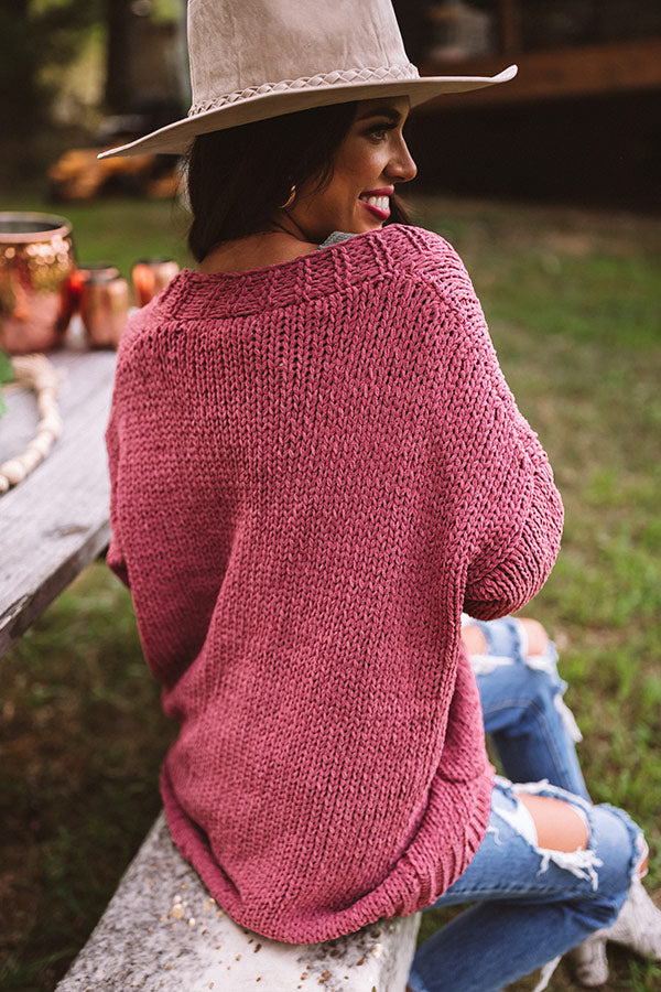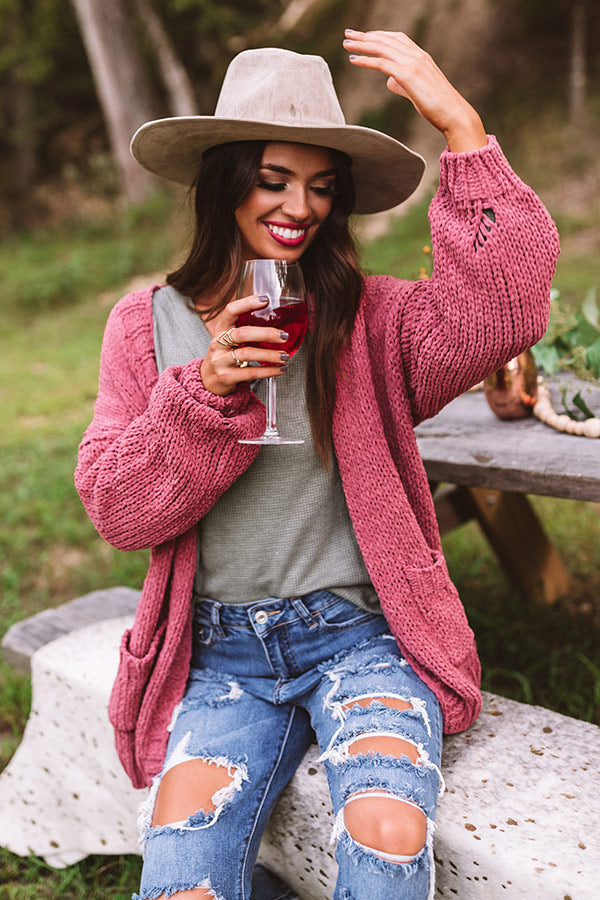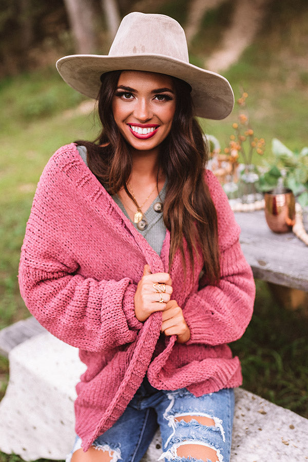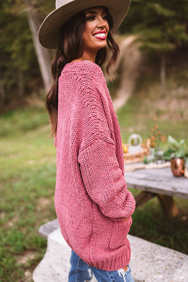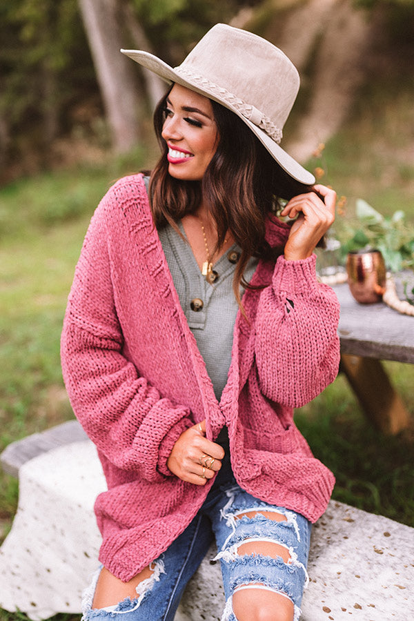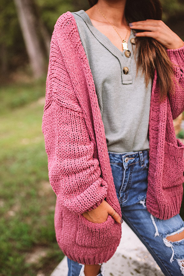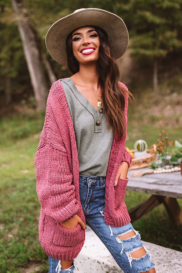 Snuggle up for the colder months in this adorable rose colored cardigan featuring ultra soft tight knit material with ribbed texturing, long oversized sleeves with fitted cuffs, low accent side pockets, and a relaxed open front silhouette that falls into a straight mid-thigh length hemline! Measurements