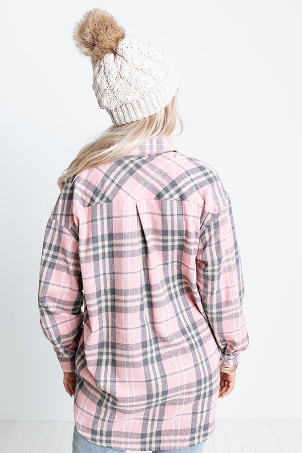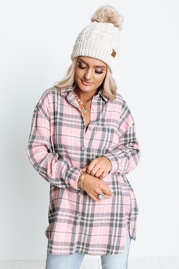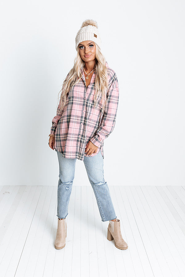 You will feel so cuddly when you wear this adorable pink flannel featuring lightweight material patterned with a grey plaid print, a button down front with a collared neckline, long loose sleeves with button closure cuffs, a single accent chest pocket, and a relaxed silhouette that falls into a rounded hemline! Measurements